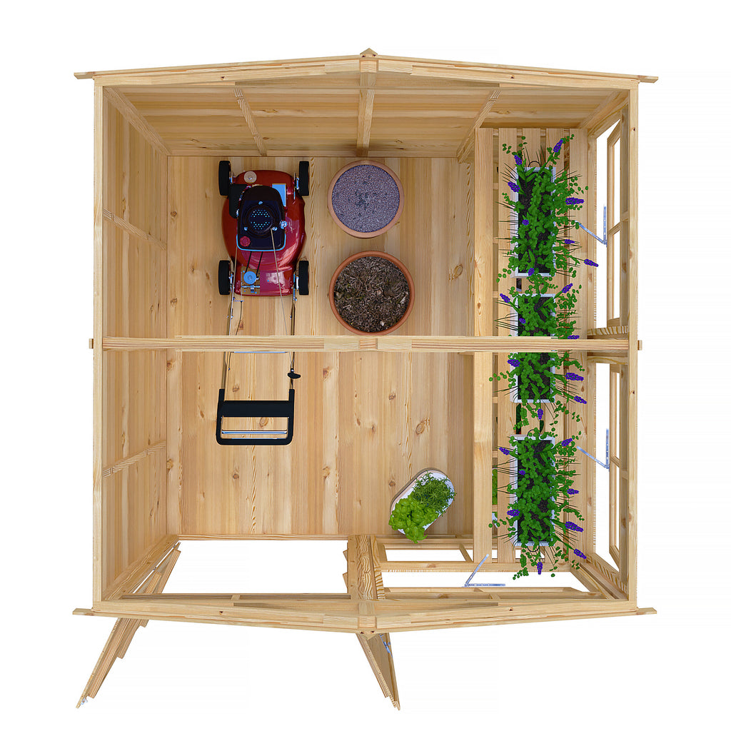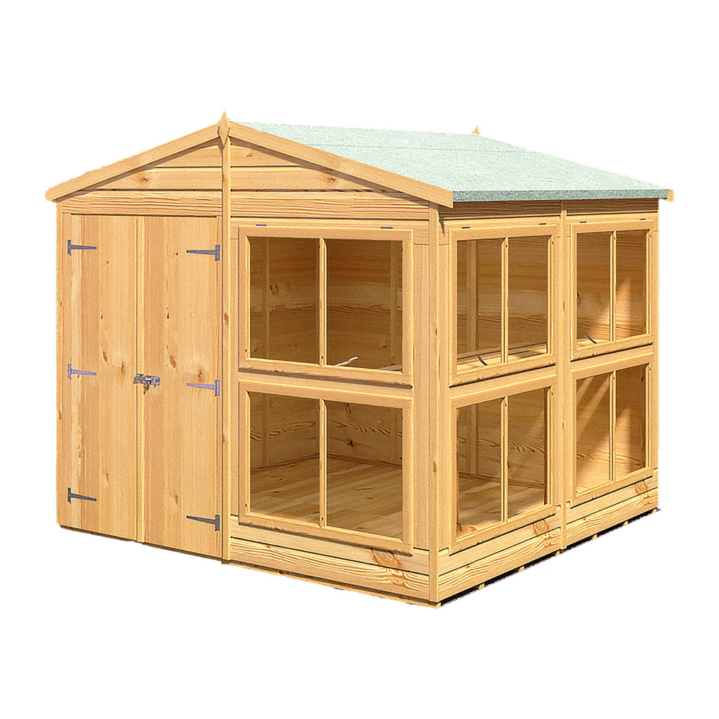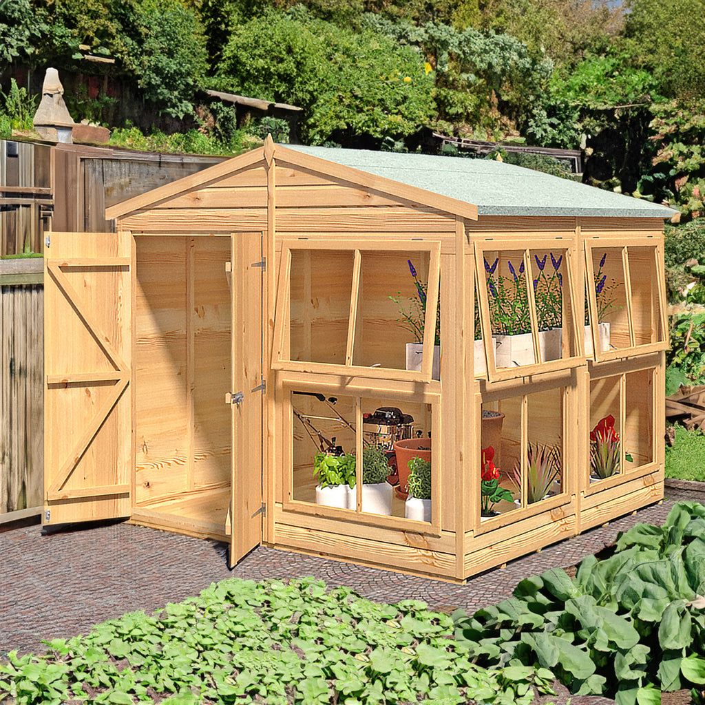 An extremely attractive potting shed complete with a handy bench; as its name suggests the Sun Hut is designed for maximum light! Glazed with toughened glass, the top windows are opening. The shiplap cladding is 12mm slow grown, very high grade FSC approved pine on sturdy 34mm square framing with both floor and roof also in T&G. The framed double door is fitted with a padbolt. The shed has been dipped with a base coat preservative ready for you to top coat to your own preference.