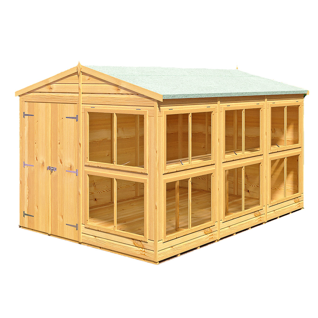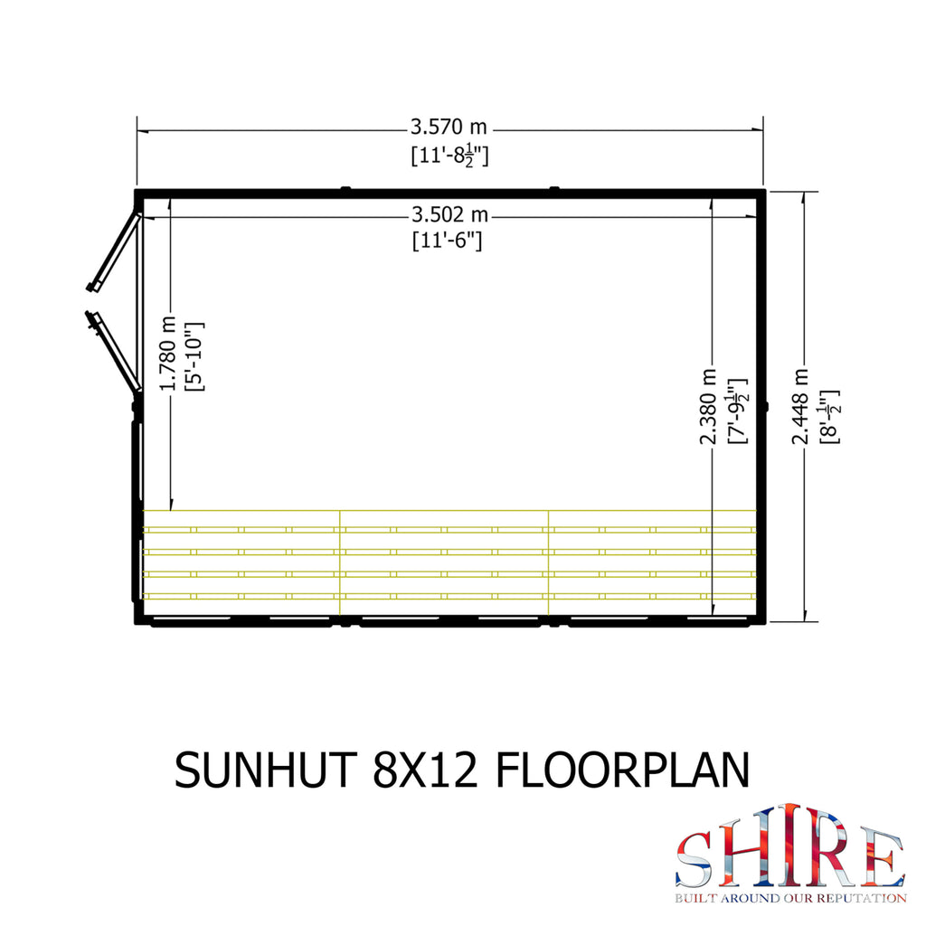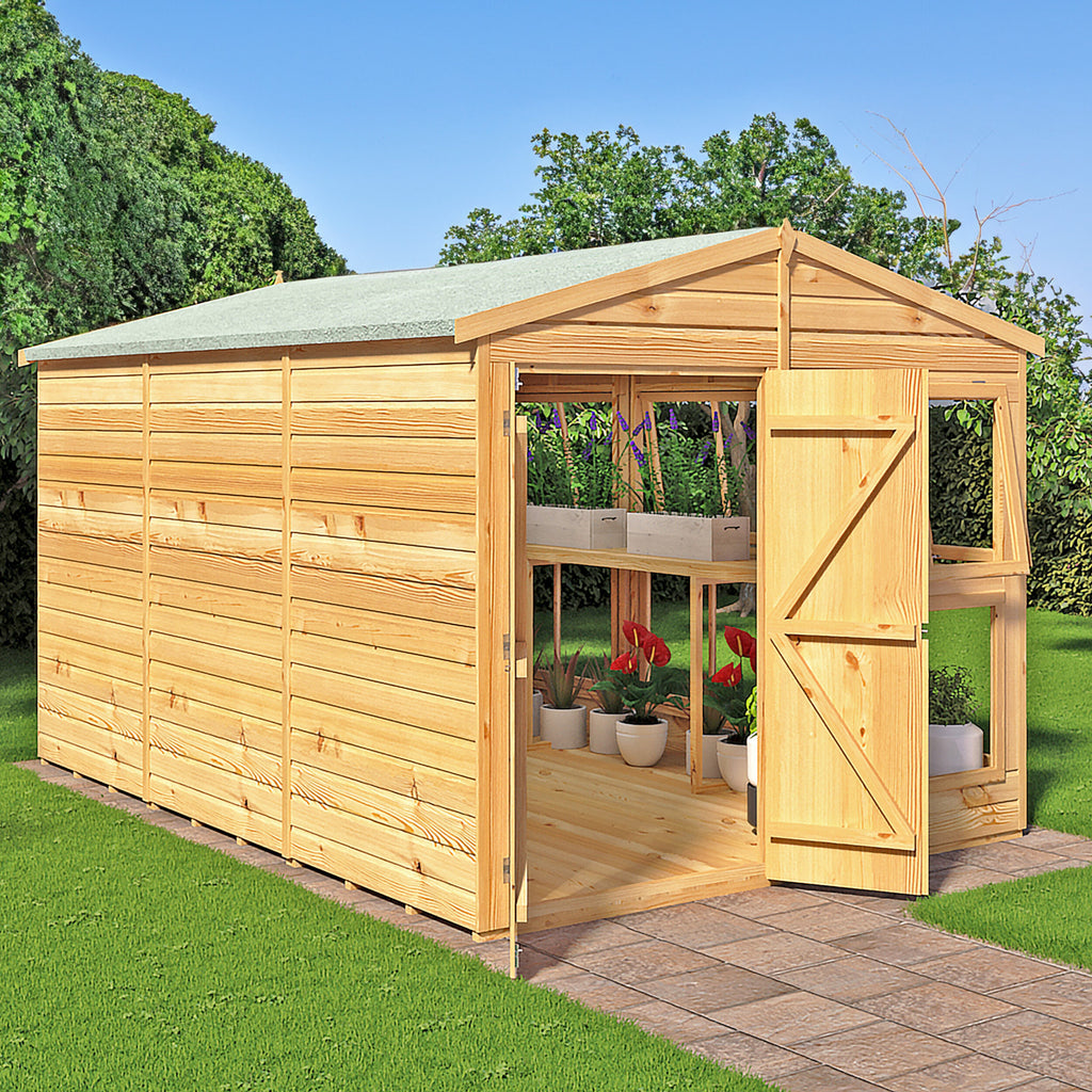 An extremely attractive potting shed complete with a handy bench; as its name suggests the Sun Hut is designed for maximum light! Glazed with toughened glass, the top windows are opening. The shiplap cladding is 12mm slow grown, very high grade FSC approved pine on sturdy 34mm square framing with both floor and roof also in T&G. The framed double door is fitted with a padbolt. The shed has been dipped with a base coat preservative ready for you to top coat to your own preference.