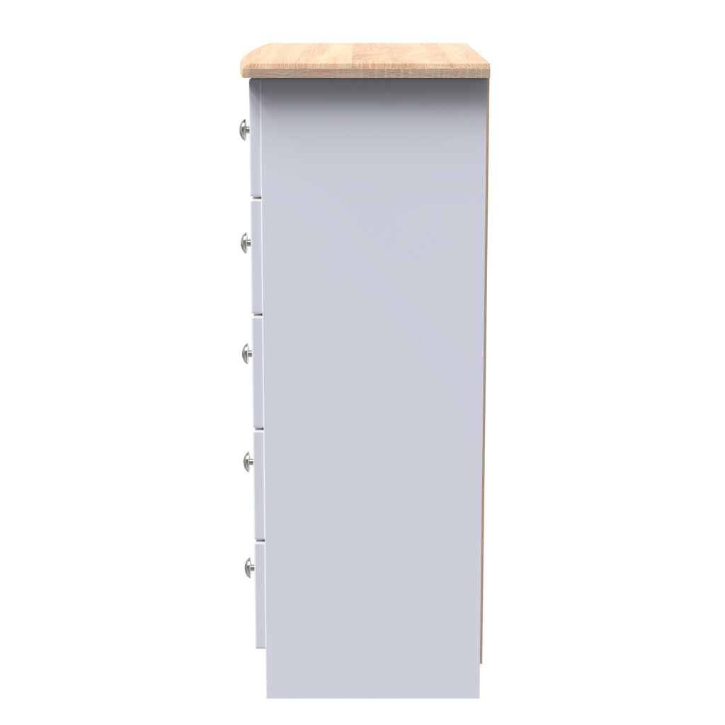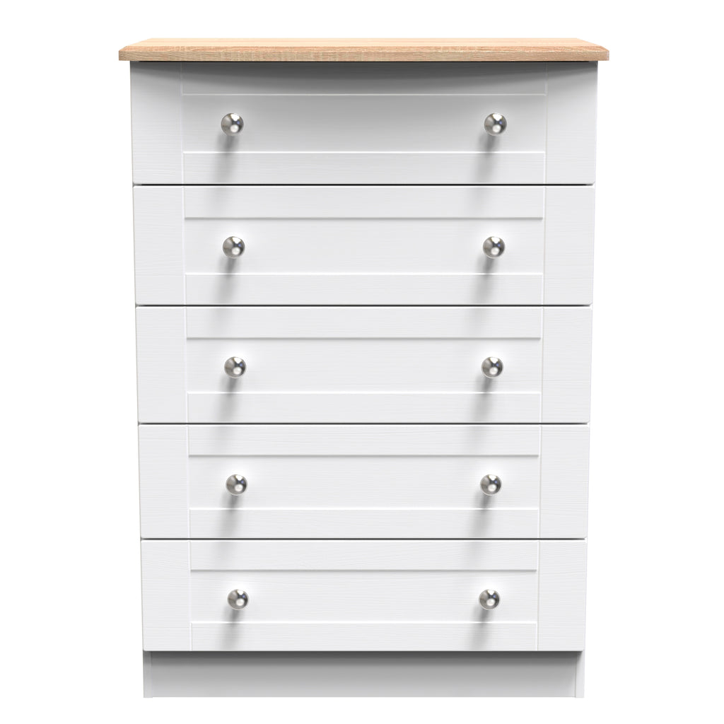 (Dimensions: H108 x W77 x D42cm) This wide 5 drawer chest of drawers is practical and stylish. Perfect for any home as a free standing storage unit. Wood grain effect, panelled design, recessed fronts, contrasting wood top and chrome handles, the Sussex Range is a beautifully elegant collection. With this range you have the freedom to choose from a wide range of furniture configurations, allowing you to create the perfect combination to optimise your storage space. All our furniture is made in the United Kingdom, to the highest quality. It is delivered direct to your location of choice by one of our two man delivery teams, and comes fully assembled - Please Note that any handles or legs may be removed durning transit to avoid the risk of damage.