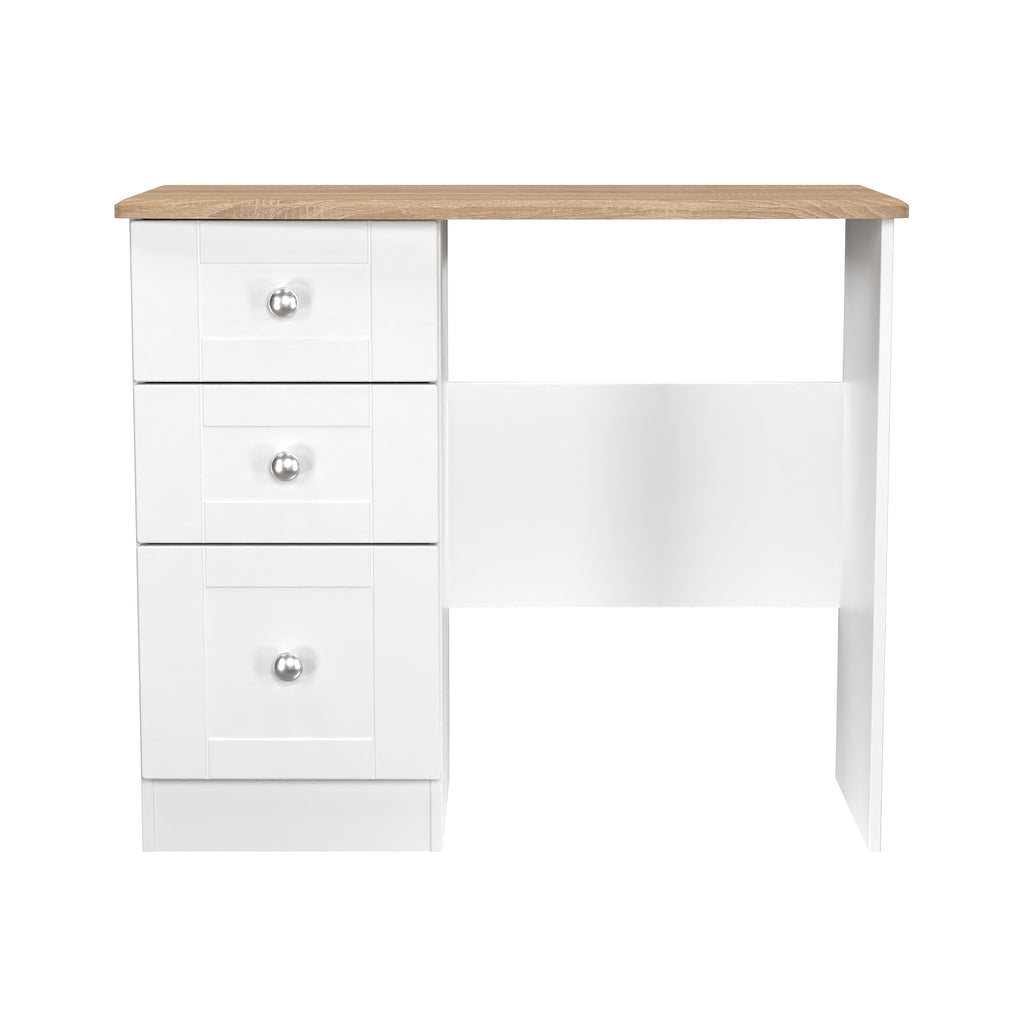 (Dimensions: H80 x W93 x D42cm) This practical 3 drawer narrow desk/vanity is perfect for any bedroom or office. A matching stool and mirror (in 2 sizes) are also available. Wood grain effect, panelled design, recessed fronts, contrasting wood top and chrome handles, the Sussex Range is a beautifully elegant collection. With this range you have the freedom to choose from a wide range of furniture configurations, allowing you to create the perfect combination to optimise your storage space. All our furniture is made in the United Kingdom, to the highest quality. It is delivered direct to your location of choice by one of our two man delivery teams, and comes fully assembled - Please Note that any handles or legs may be removed durning transit to avoid the risk of damage.