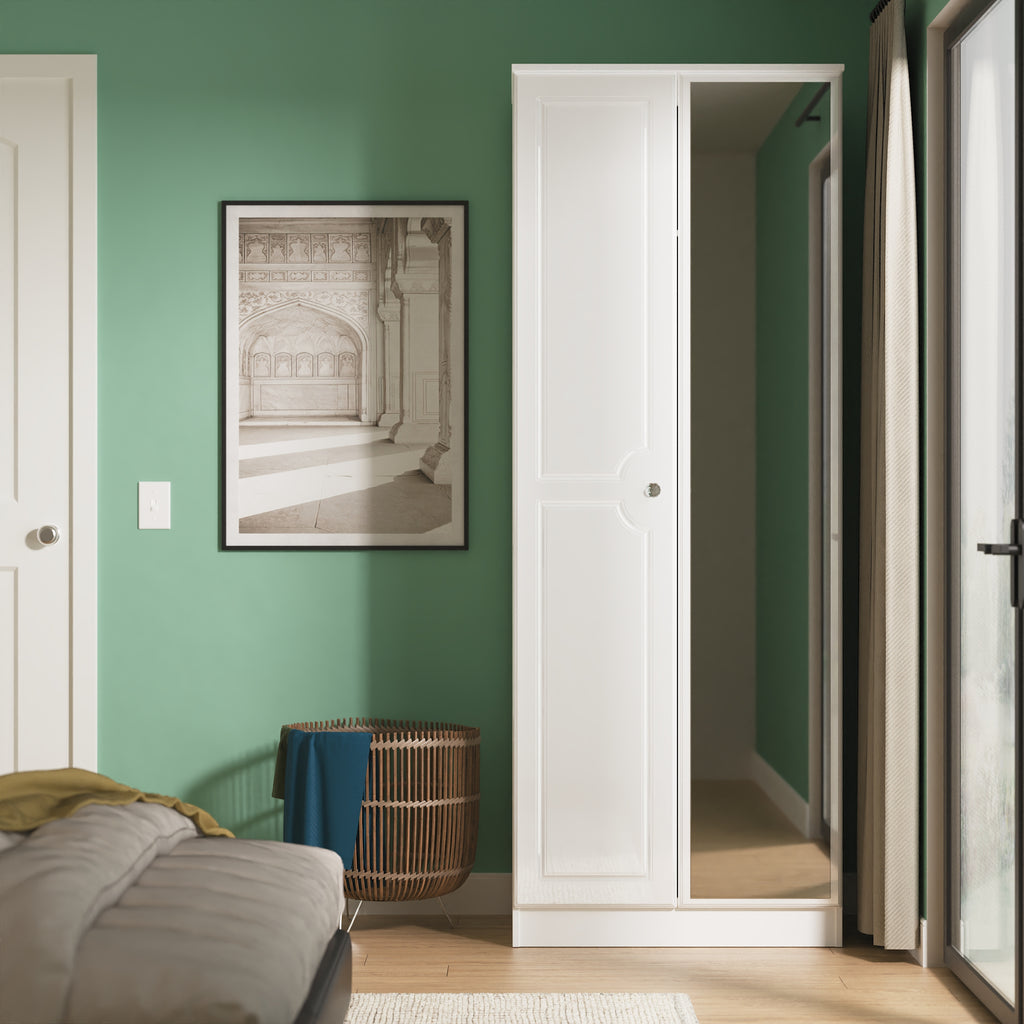 Featuring high gloss white doors with matte white sides and top, this white gloss wardrobe with mirror adds a bright, elegant touch to any bedroom. The full-height external mirrored single door is perfect for dressing, while visually enlarging your space.