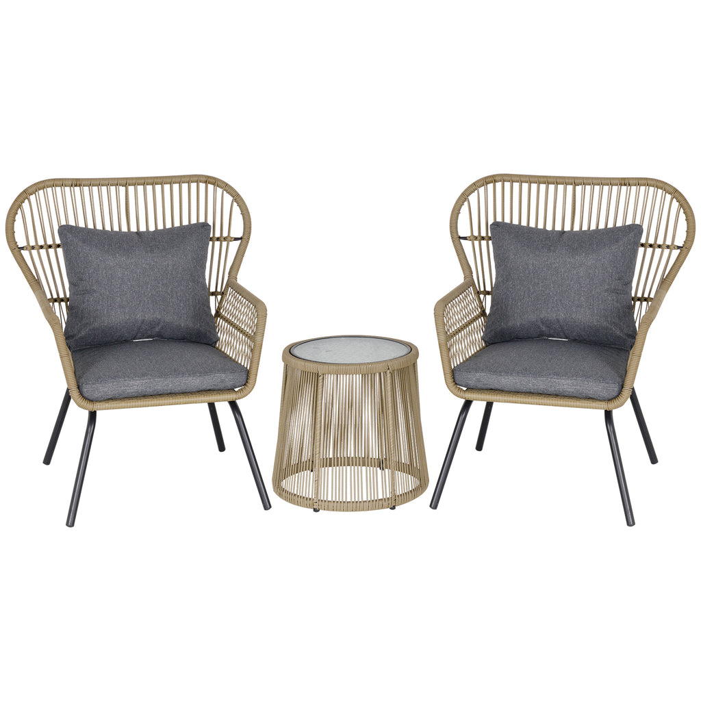 A traditional garden set gets a modern update with this seating set from Outsunny. Here we see the two chairs formed into a wing shape, where steel forms the frame and is wrapped in PE wicker in a webbed design - a look which is elegant and stands out beautifully. Each chair comes with a back and seat cushion for comfort, and the round table, in the same design, is fitted with a glass top for long-term use. Making a statement this season has never looked so good.