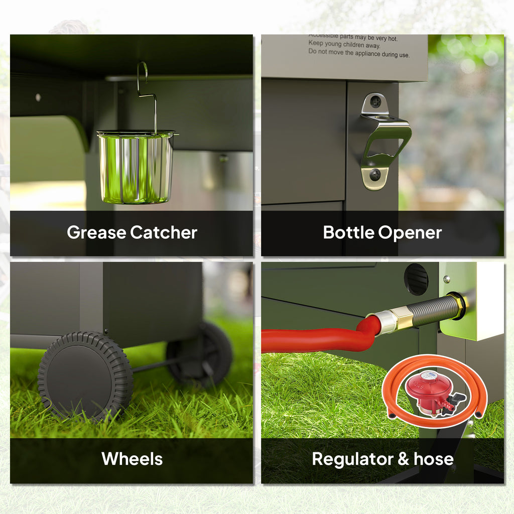 Fire up your outdoor feasts with this Outsunny three-burner gas bbq. The 2378 cm² grilling area is spacious enough for cooking for roughly 5-10 people, with a warming rack to keep food warm when cooked. With a see-through panel on the lid to see inside easily, completed with a thermometer to keep the inner temperature in check.