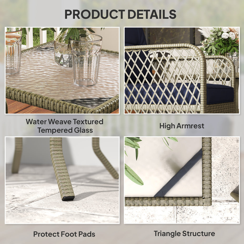 Start the season off the right way - do it with this three-piece garden set from Outsunny. Formed of two armchair-seats and a matching table, you can easily enjoy the sun with a friend. Metal forms a strong frame for all pieces, where PE wicker is wrapped around for an on-trend rattan look. The table is fitted with a tempered glass top for a solid and safe holding place. Both chairs come with thick padded cushions - simply sit down and enjoy the fresh air.