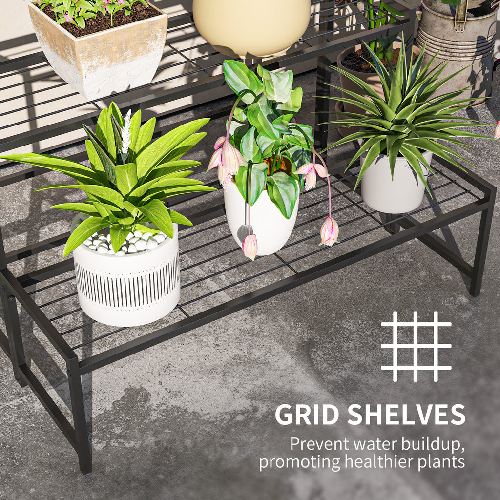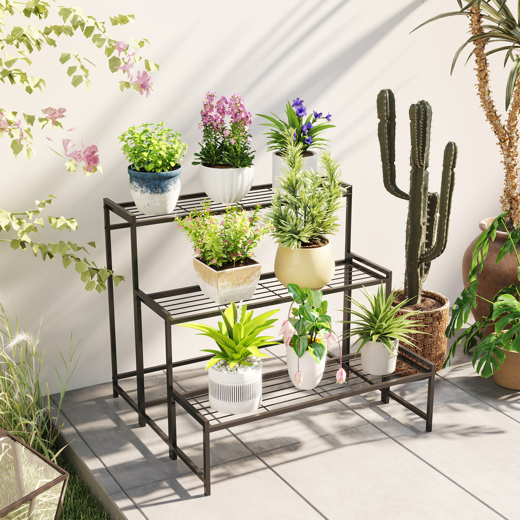 Elevate your greenery with Outsunny's Flower Stand! This 3-tier ladder design ensures every plant basks in sunlight, complemented by a chic, modern aesthetic. The grid shelves enhance air flow and drainage, suitable for both indoor and outdoor use. Crafted in rust-proof, powder-coated metal, it's a great spot for your plants, books, or décor on any balcony or garden.