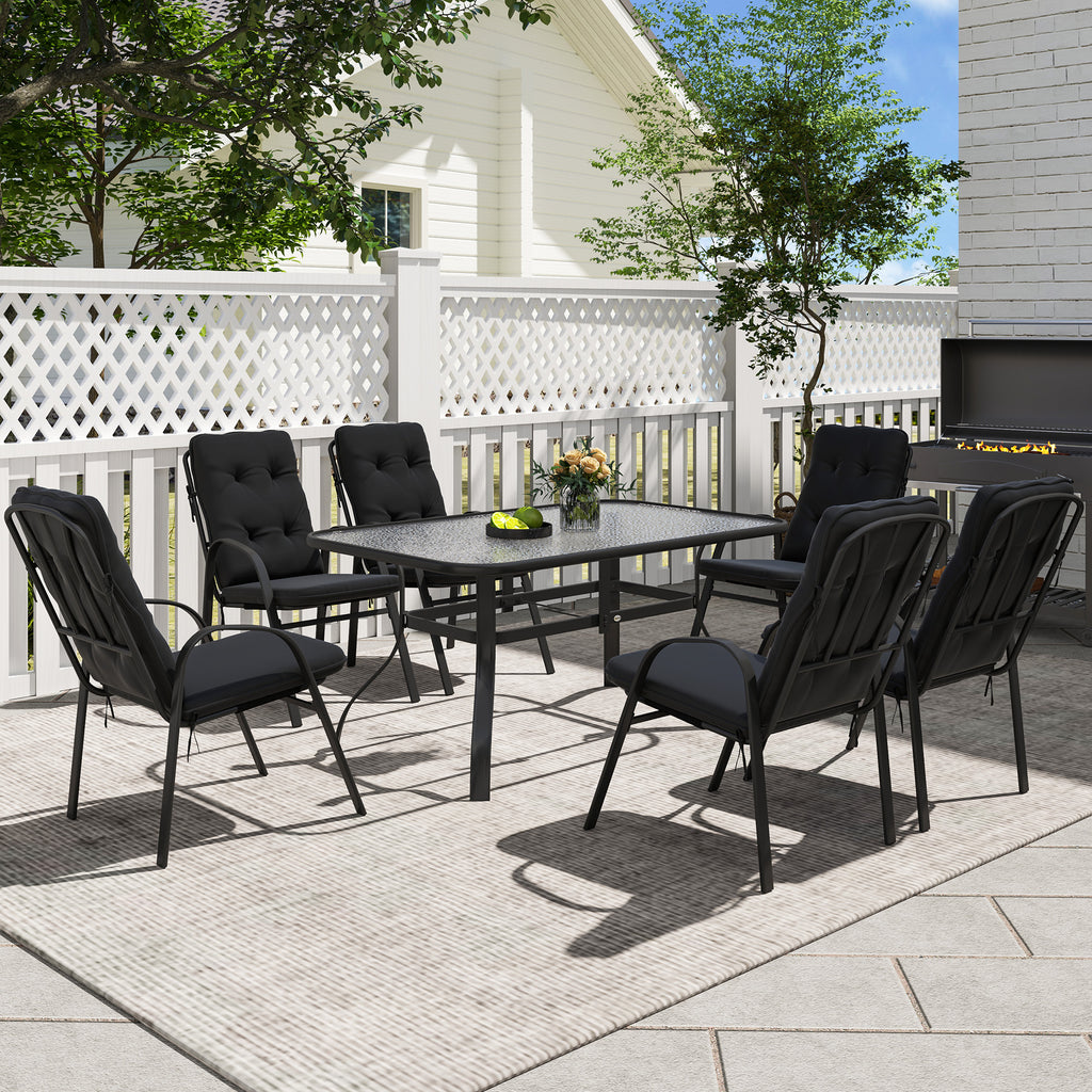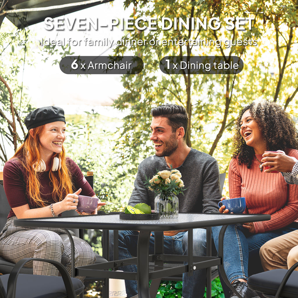 Enjoy your socialising time outdoors comfortably - look to this garden table and chairs set from Outsunny. Comes with six padded armchairs and a tempered glass-top table. Steel frames make each piece strong. High backs and armrests on the chairs for support, with a padded seat for comfort. The table is fitted with a tempered glass tabletop - comes with a middle hole to hold a parasol umbrella in place (?38 mm sized pole).