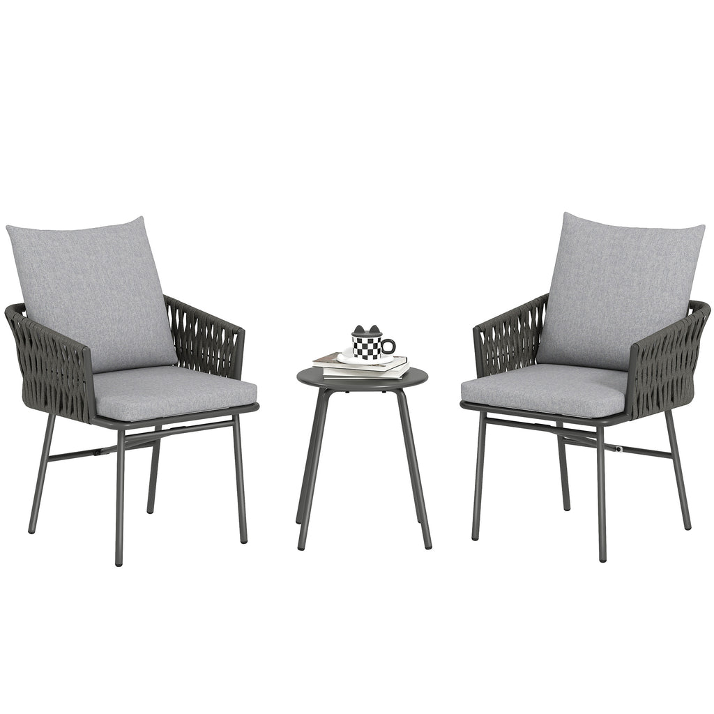 Transform your outdoor space with the Outsunny outdoor table and chairs set. This charming rattan balcony furniture set includes two cosy chairs with thick, splash-resistant cushions and a sleek, metal-topped table. Crafted from all-weather PE rattan and a rust-resistant steel frame, our bistro table and chairs are designed for comfort and durability, suitable for your garden, balcony, or patio. Enjoy easy maintenance with removable and washable cushion covers.