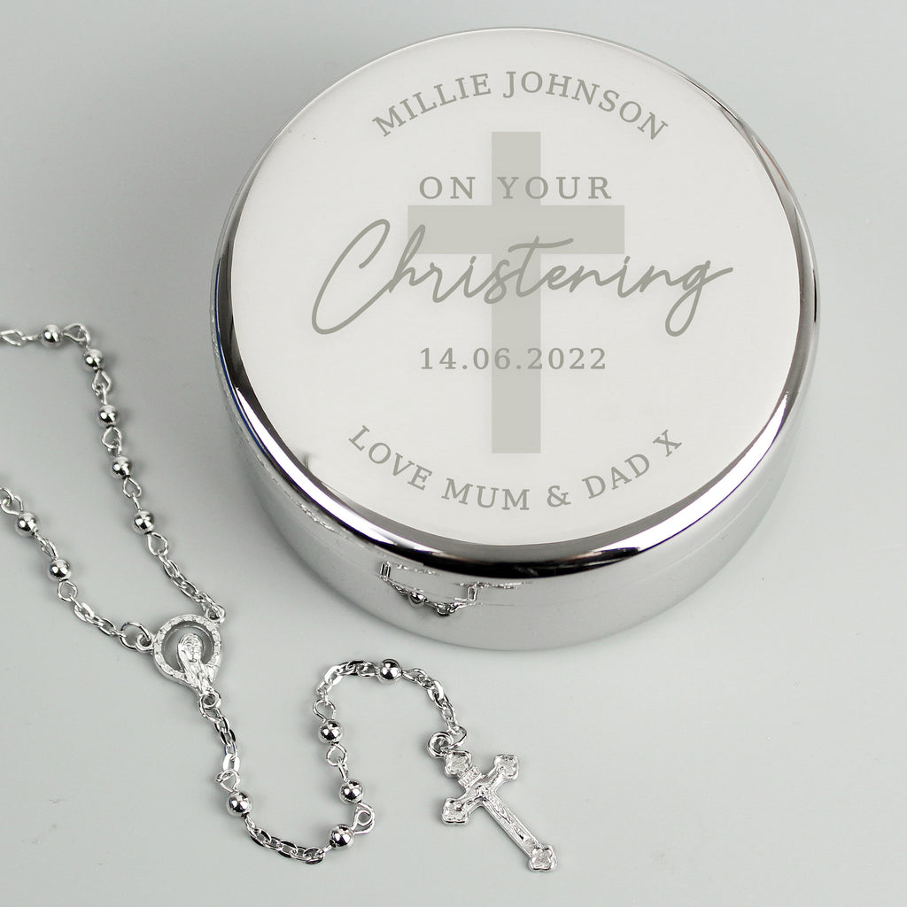 This Personalised Round Trinket box with Rosary beads is a perfect gift for their Christening