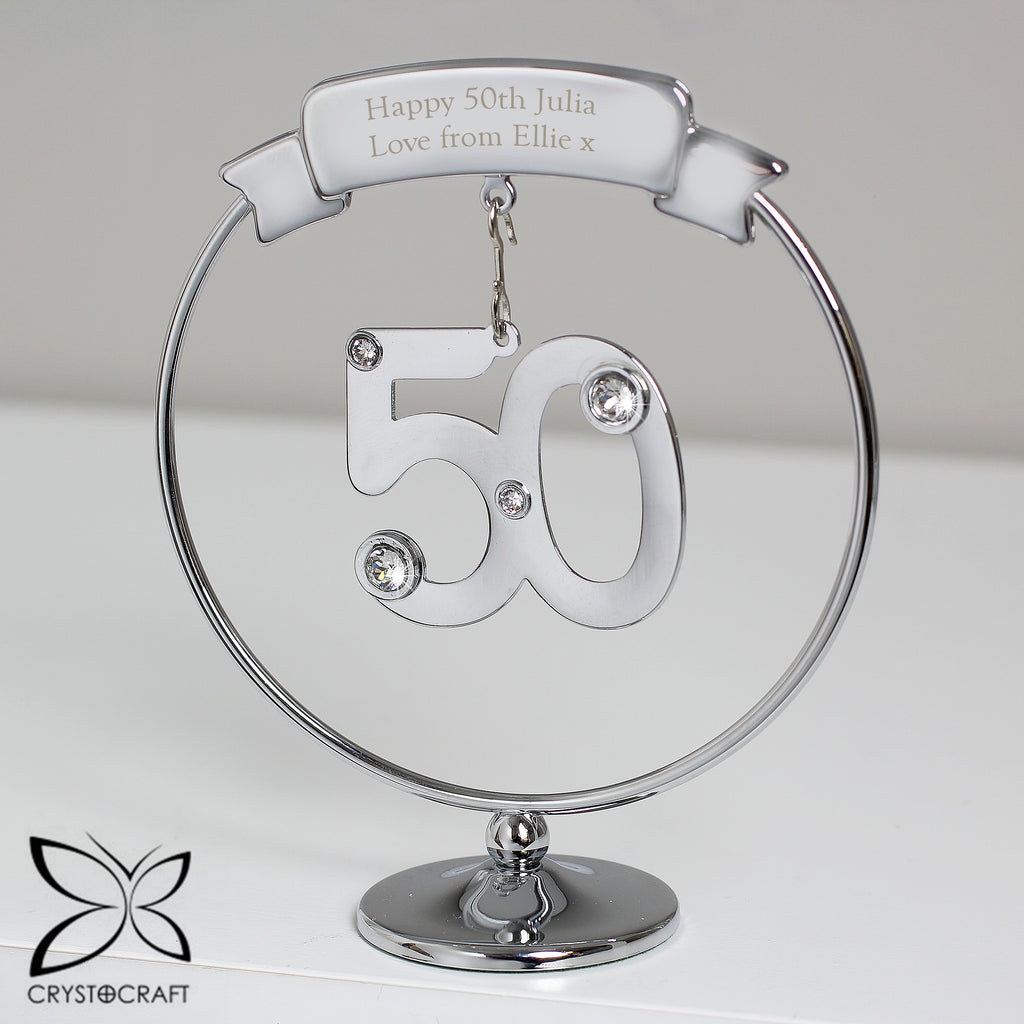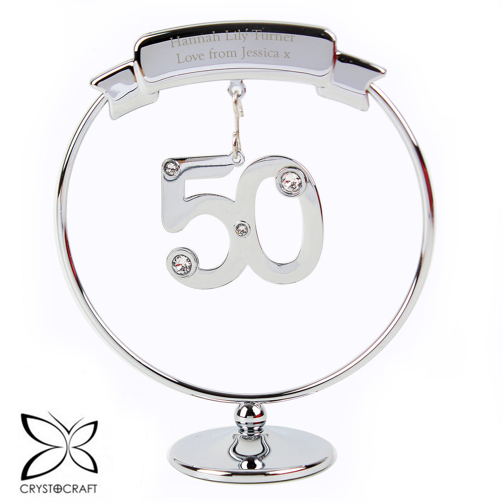 Mark their 50th Birthday or Wedding Anniversary with this elegant Crystocraft ornament. Dangling from a personalised round silver stand is a crystal clad 50. This will catch the light and bring a smile to the recipients face.