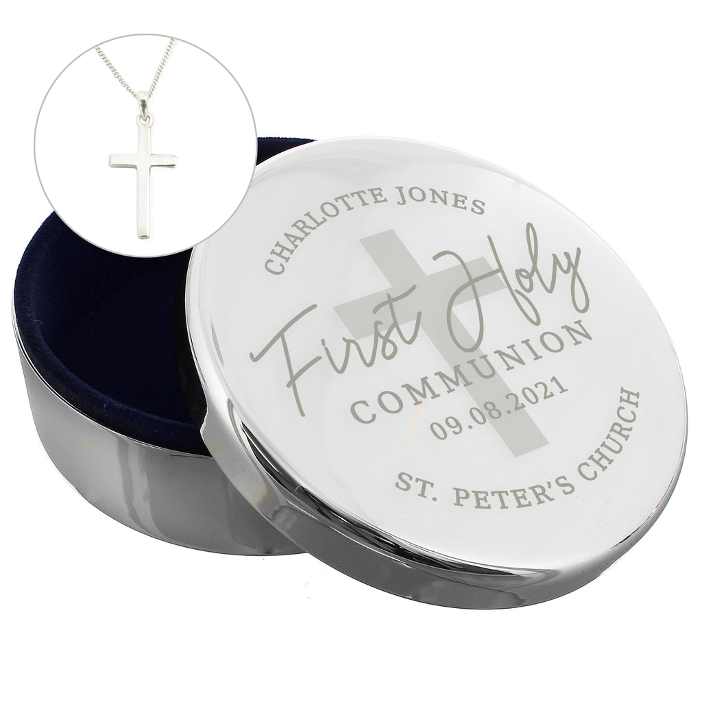 Personalised First Holy Communion Round Trinket Box & Cross Necklace Set
