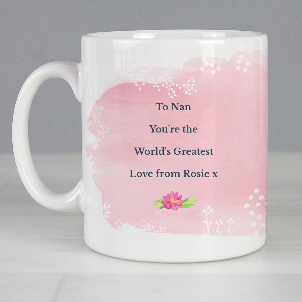 This Personalised Floral Watercolour Mug can be personalised with a name on the front of up to 12 characters. A line of text of up to 20 characters can also be added to the bottom.