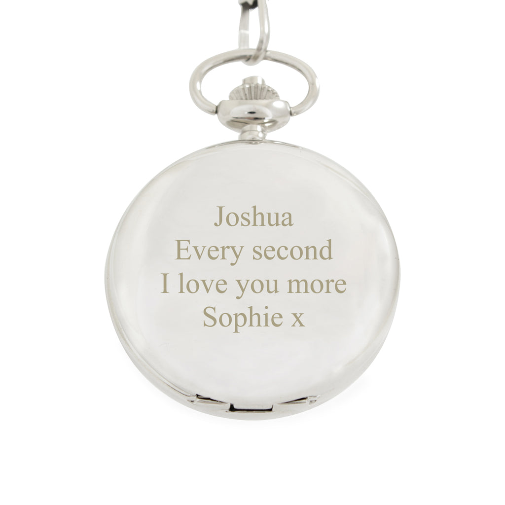 The pocket fob watch can be personalised with a message over 4 lines of text, with up to 15 characters per line.