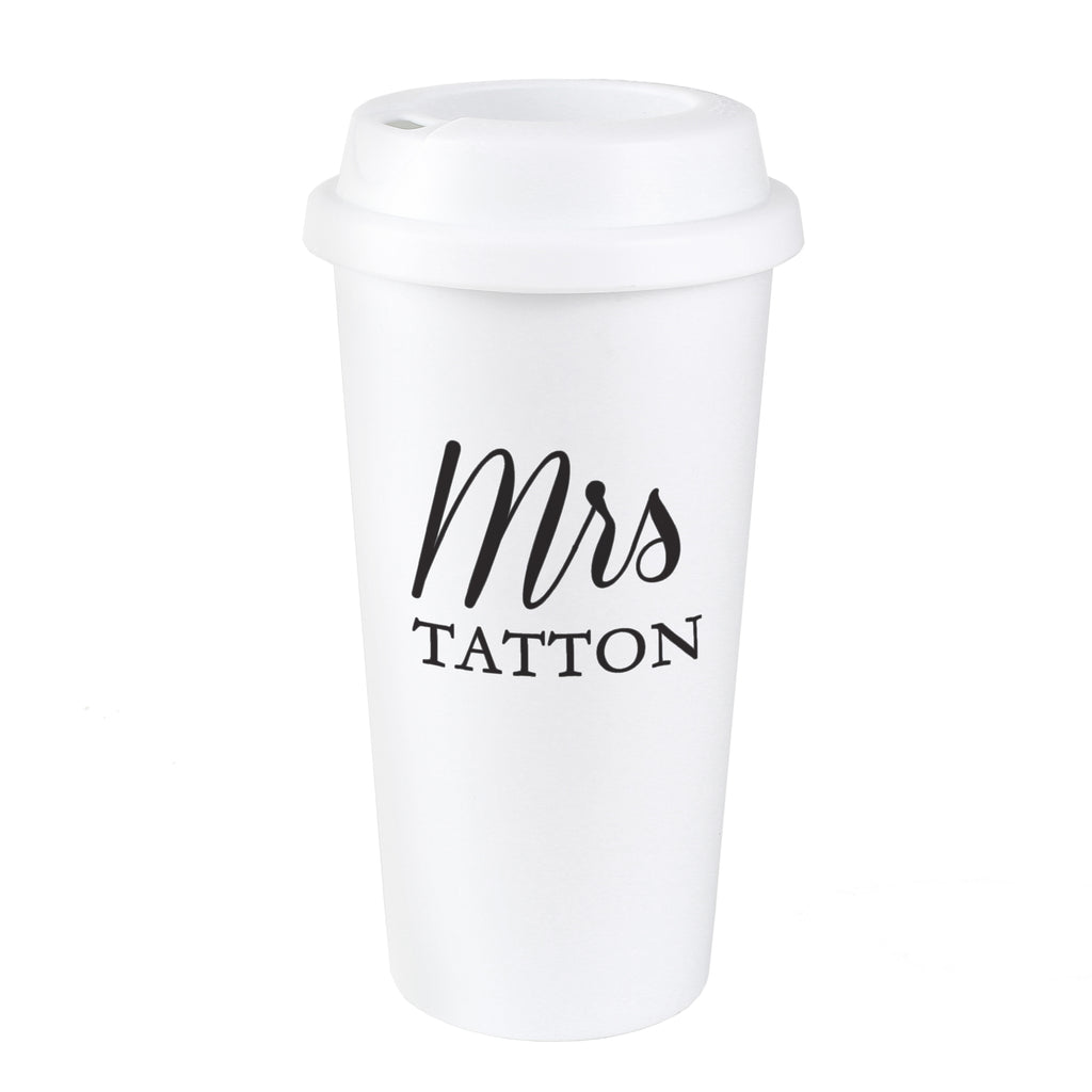 You can personalise this travel mug with a title up to 4 characters long and a name up to 12 characters long .