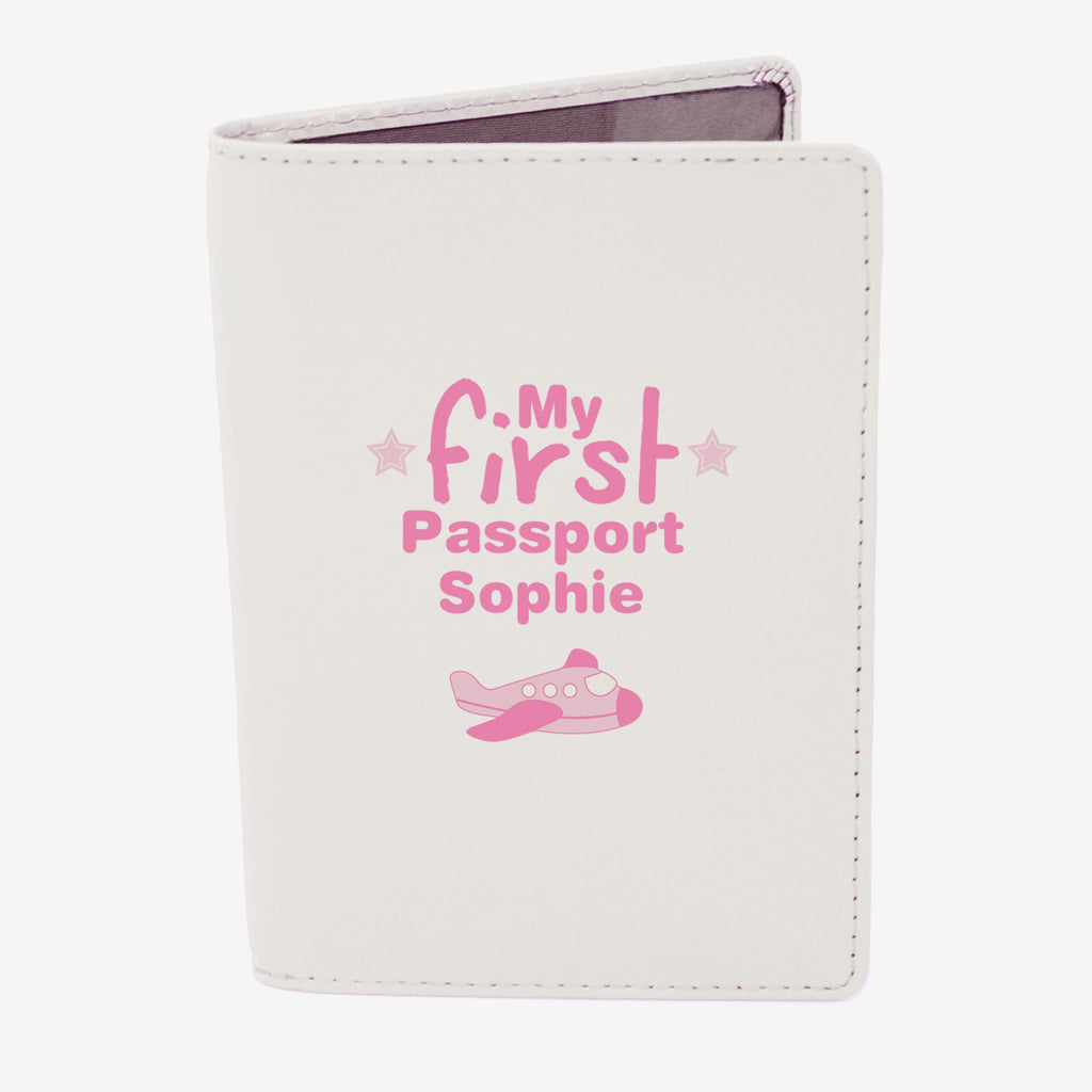 Personalise this cream 'My First' Passport holder with a name up to 12 characters. The passport features a cute aeroplane cartoon and stars