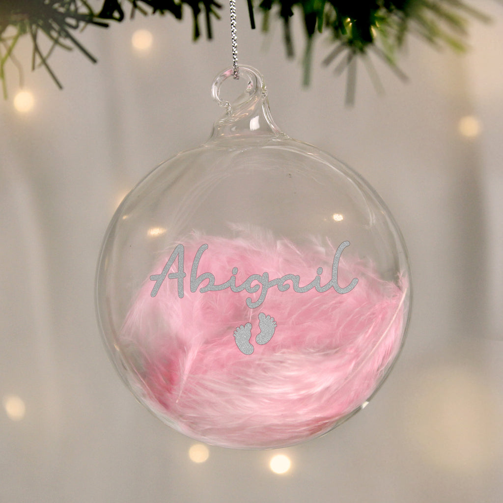 This Personalised Pink Feather Silver Feet Glass Bauble will make a stunning addition to the Christmas tree or to celebrate the birth of a baby girl!