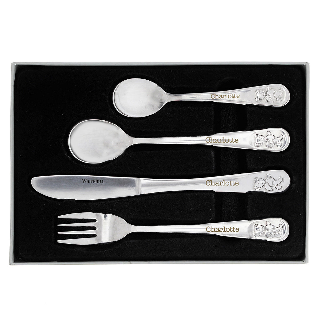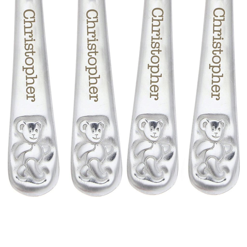 This stylish 4 piece set of steel cutlery featuring a cute teddy design can be personalised with any name up to 15 characters.