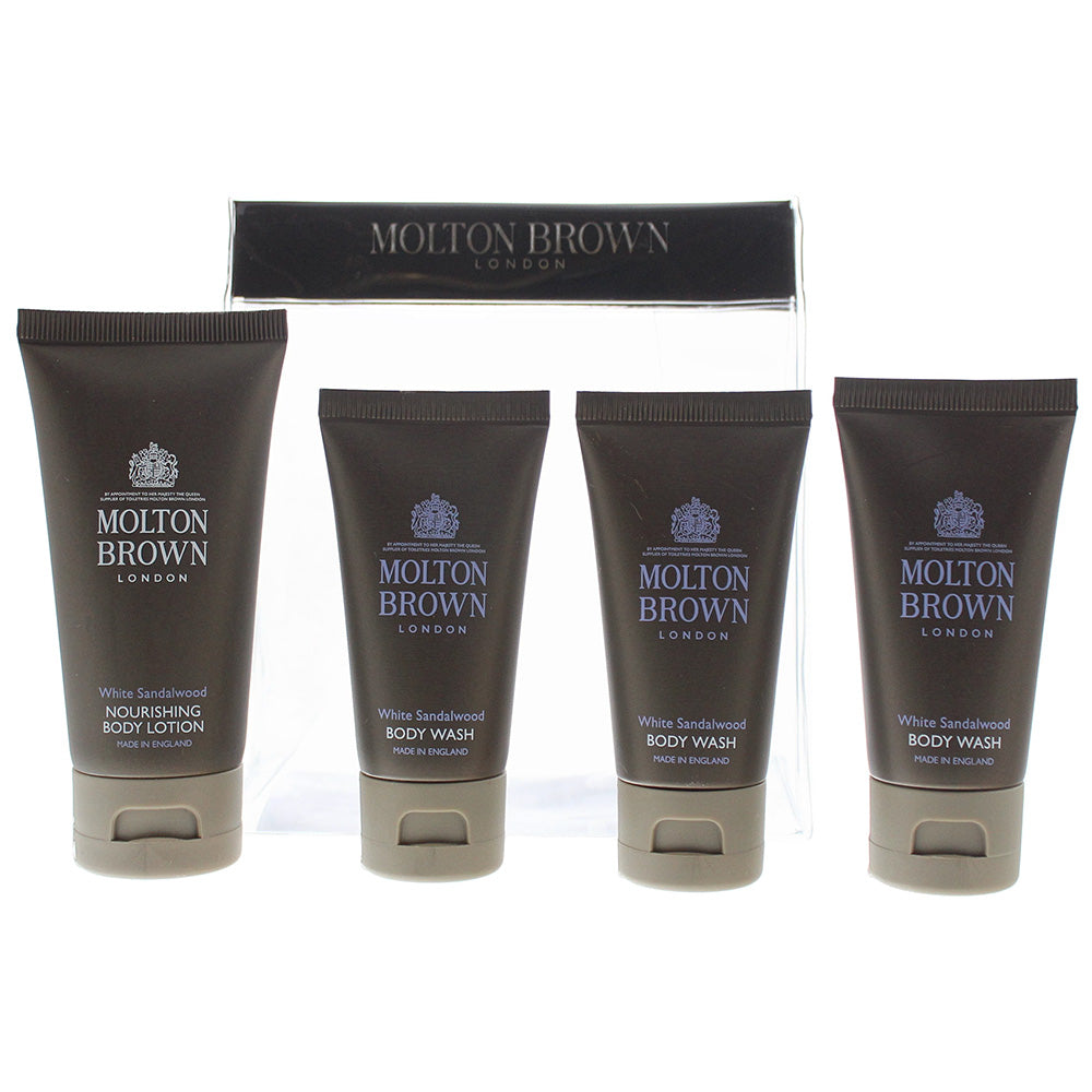Molton Brown White Sandalwood 4 Piece Gift Set: Body Lotion 50ml - 3 x Body Wash 30ml. Treat yourself with a moisturizing and nourishing body lotion. A smoothing body wash that cleans your skin leaving you feeling fresh.