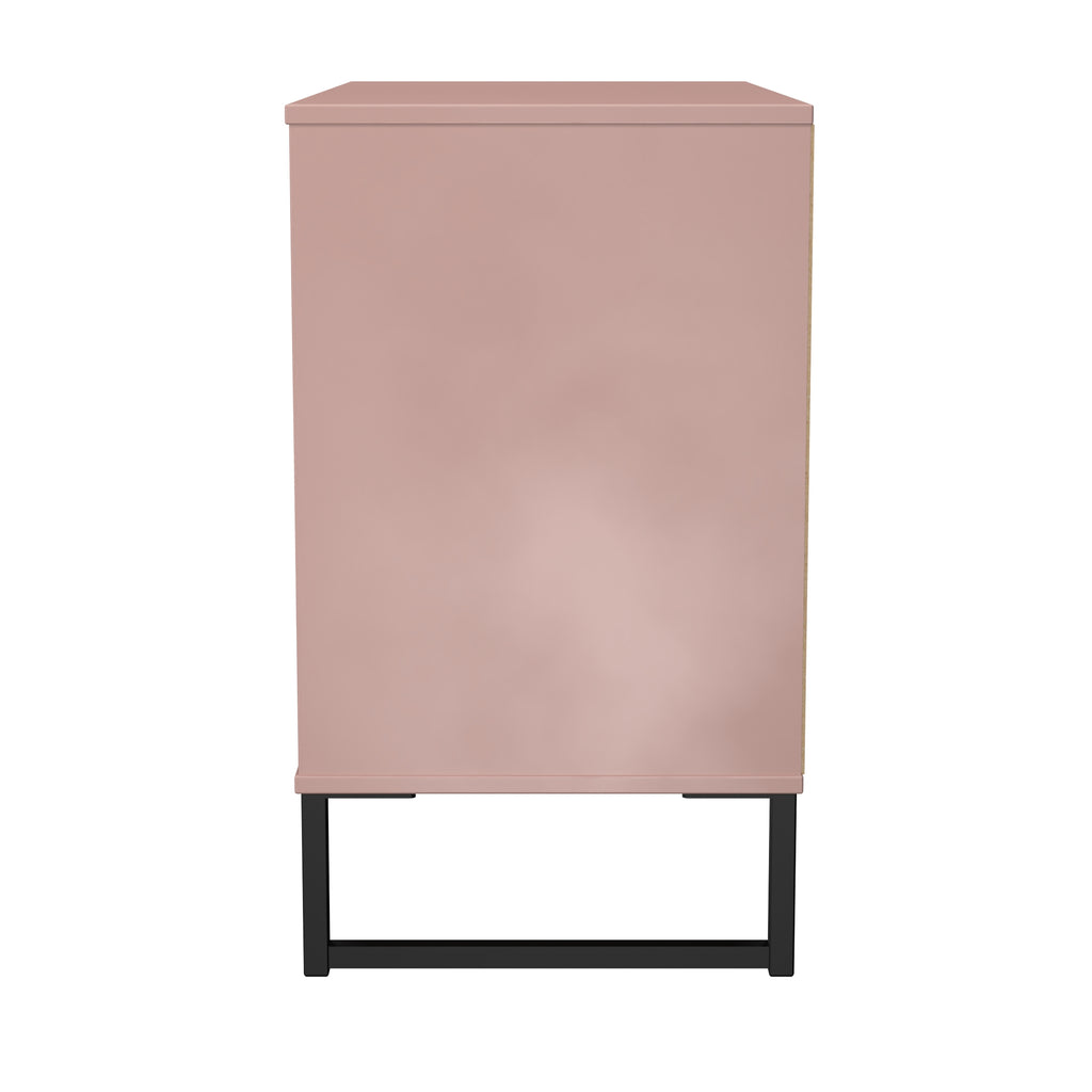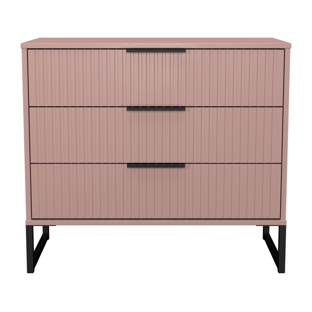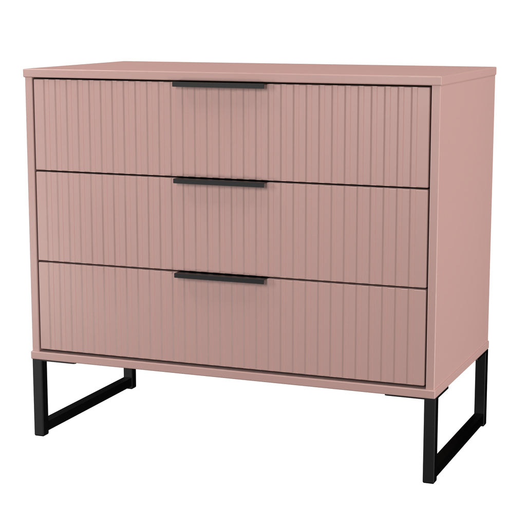 (Dimensions: H76 x W77 x D40cm) This wide 3 drawer chest of drawers is practical and stylish. Perfect for any home as a free standing storage unit. A new stand out range, named for the new deep cut "fluted" grove patten of the drawer and door fronts. Featuring black metal handles and black sleigh legs. A striking and individual range that is perfect for the modern home. All our furniture is made in the United Kingdom, to the highest quality using responsibly sourced materials. It is delivered direct to your location of choice by one of our two man delivery teams, and comes fully assembled (although items with legs will have those legs removed during transit to avoid damage).