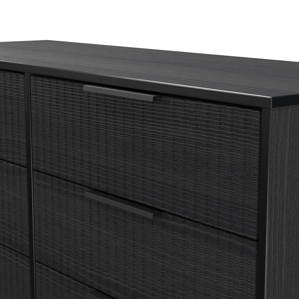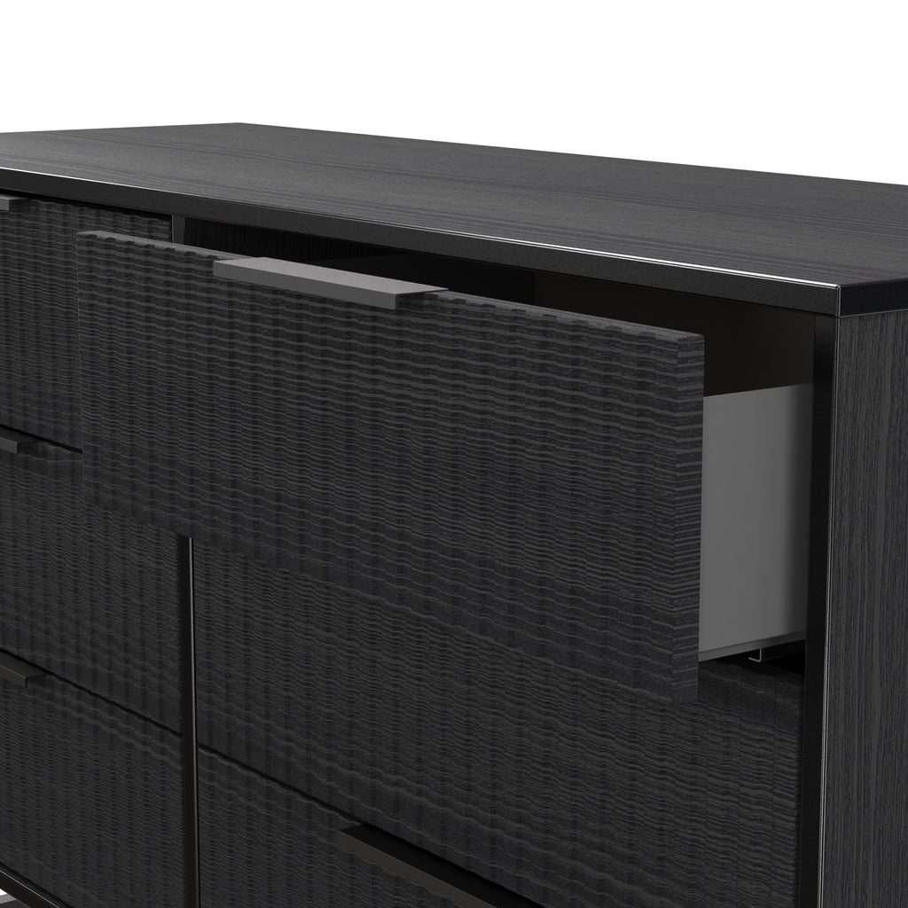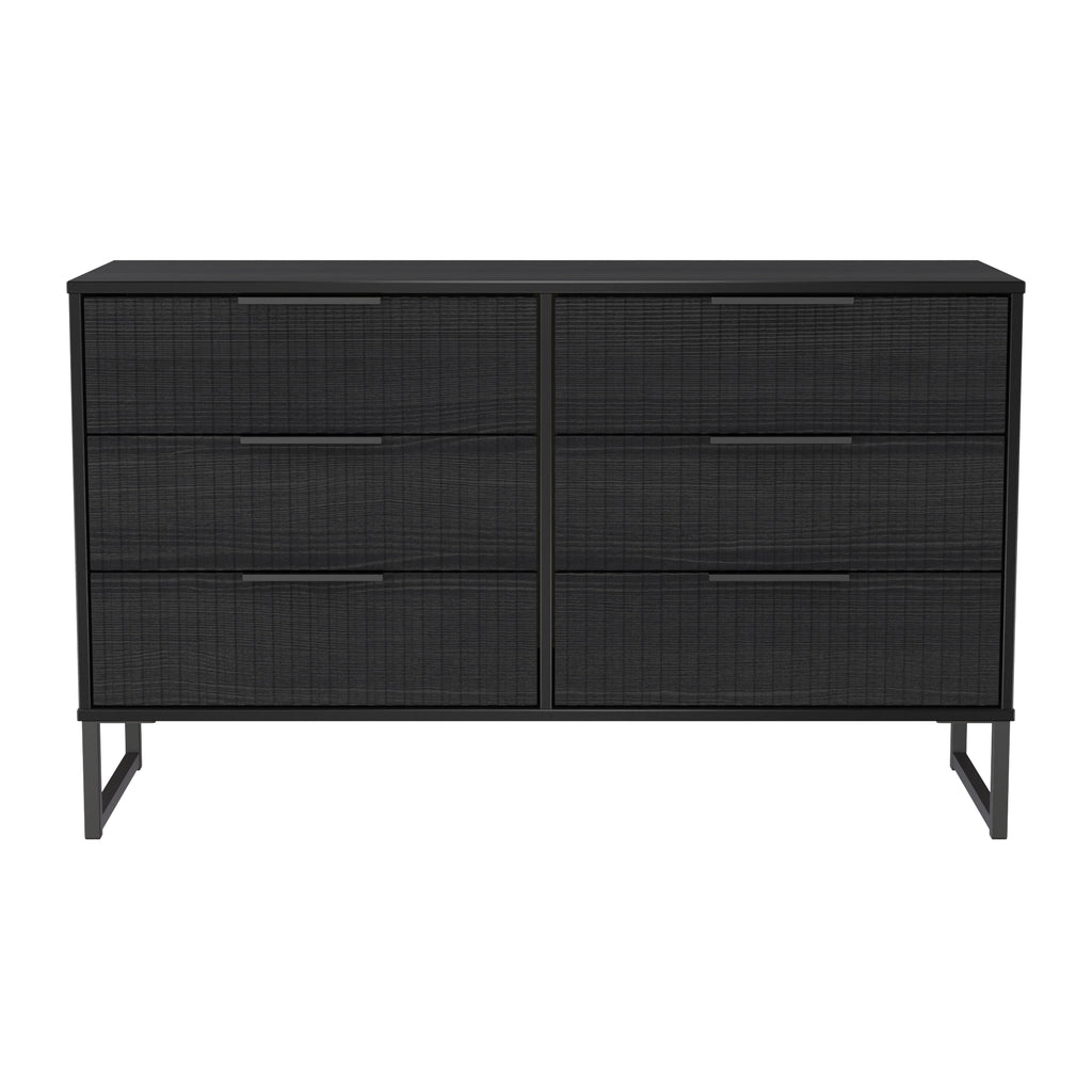 (Dimensions: H76 x W115 x D40cm) This double width 6 drawer chest of drawers is practical and stylish. Perfect for any home as a free standing storage unit. A new stand out range, named for the new deep cut "fluted" grove patten of the drawer and door fronts. Featuring black metal handles and black sleigh legs. A striking and individual range that is perfect for the modern home. All our furniture is made in the United Kingdom, to the highest quality using responsibly sourced materials. It is delivered direct to your location of choice by one of our two man delivery teams, and comes fully assembled (although items with legs will have those legs removed during transit to avoid damage).