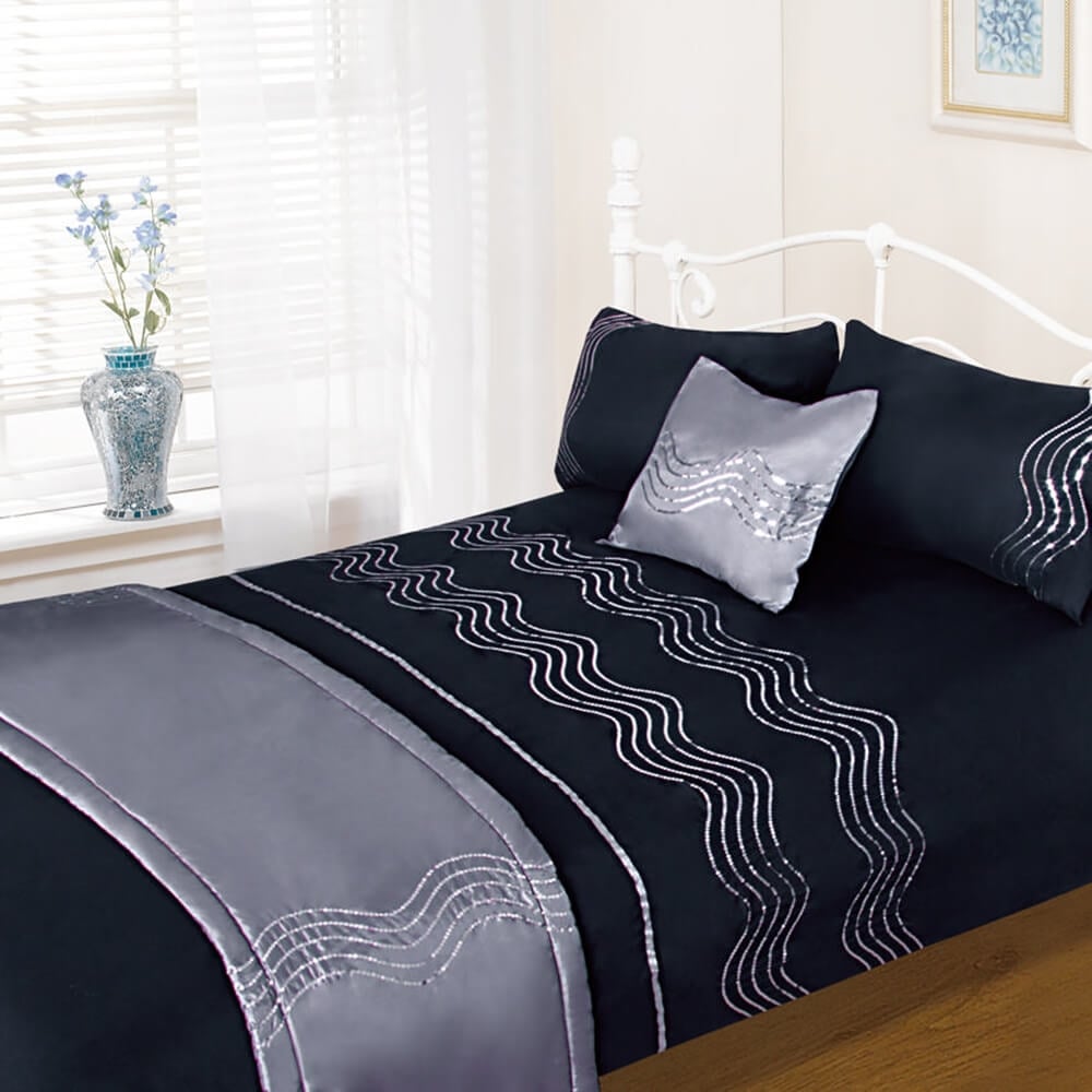The Sparkle complete bedding set, contains everything you need to refresh your bedspace, and inject new personality into your bedroom. 5 pieces complete your bed makeover with a coordinating runner, cushion cover, duvet cover and pillowcases. Waves of delicate sequins feature on a plain ground, and is echoed on the contrasting cushion cover and quilted runner, making this the perfect way to cheer up your bedroom decor.