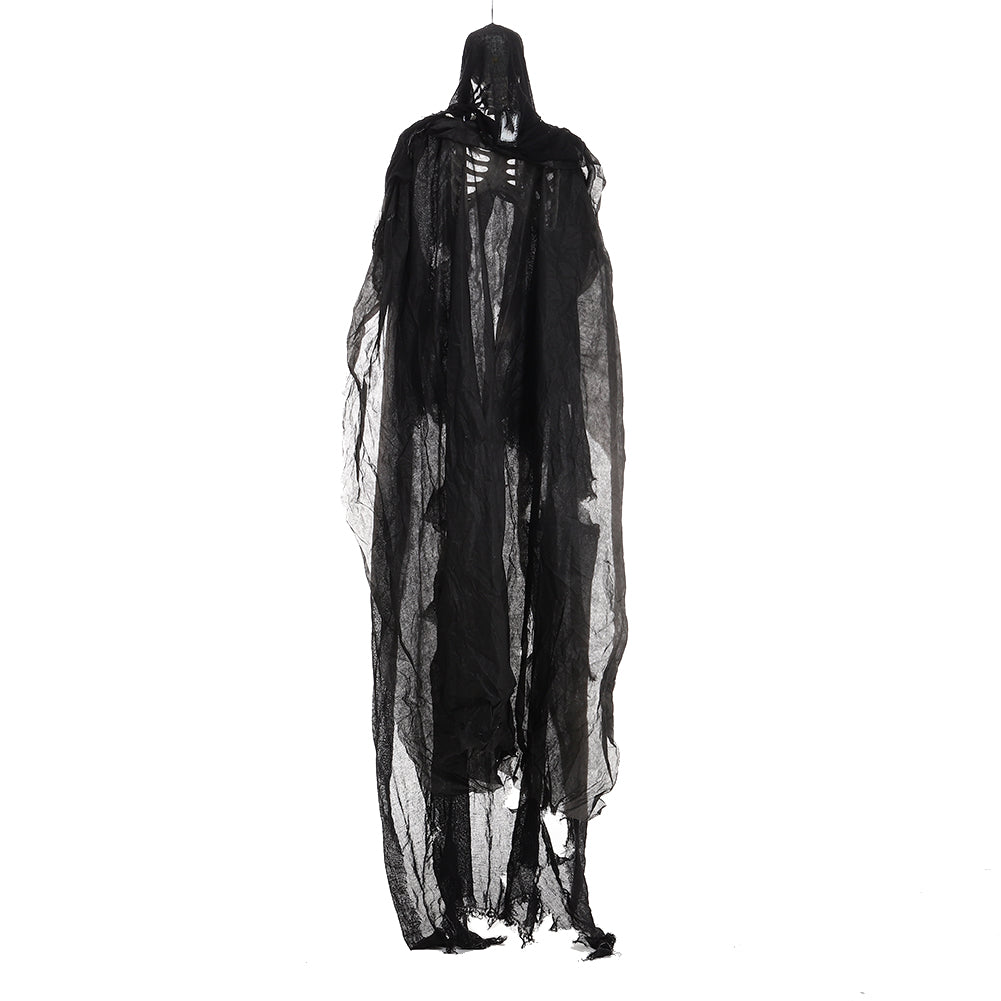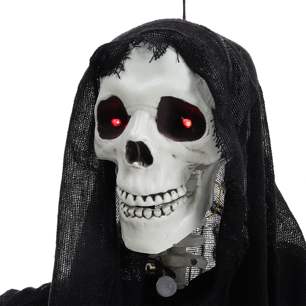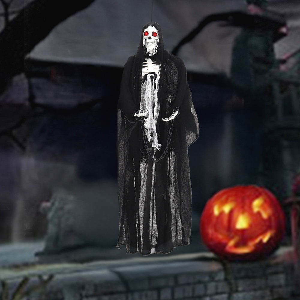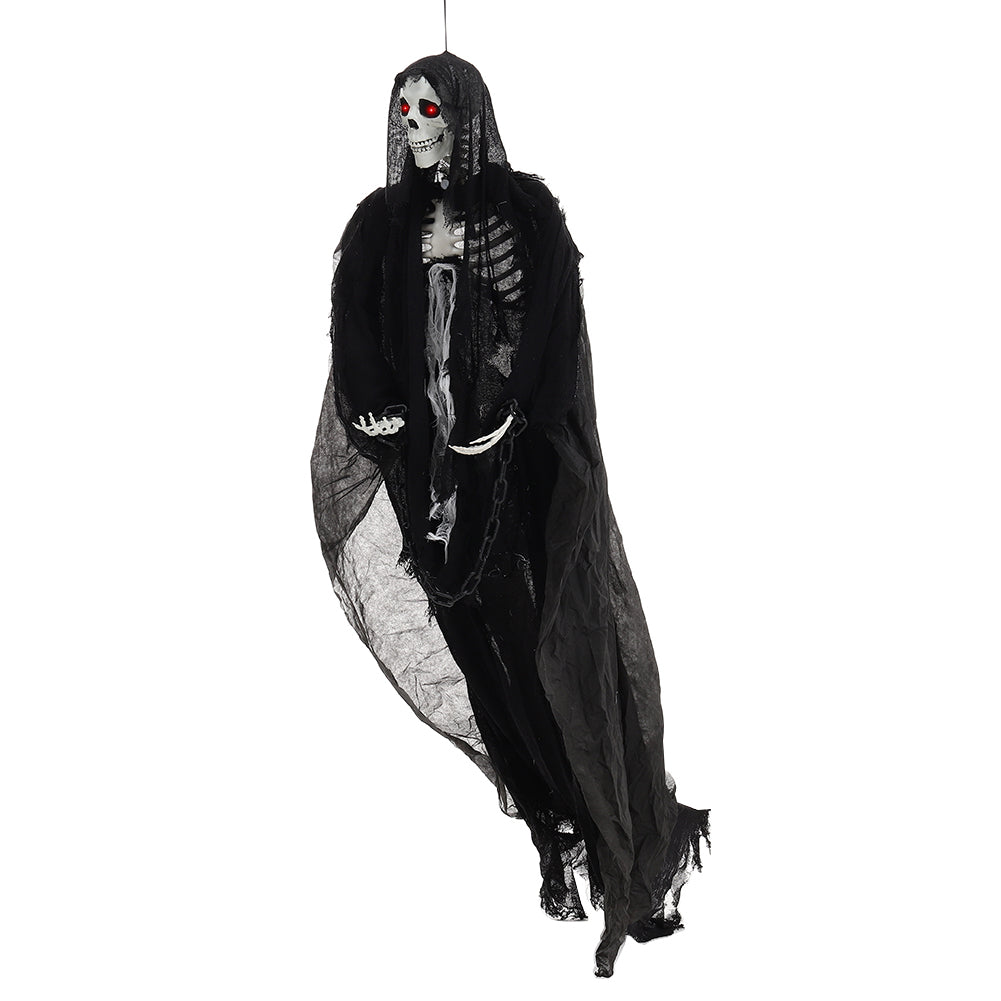 Bring spine-chilling fun to your Halloween with this 170cm hanging skeleton ghost featuring tattered clothes and chained hands. The skull watches silently in the darkness until motion triggers glowing red eyes and a terrifying scream. Crafted from premium materials, it is durable and reusable for multiple seasons. Lightweight design with an attached string allows for easy hanging anywhere. Perfect for Halloween haunted houses themed parties or any event needing a spooky atmosphere.