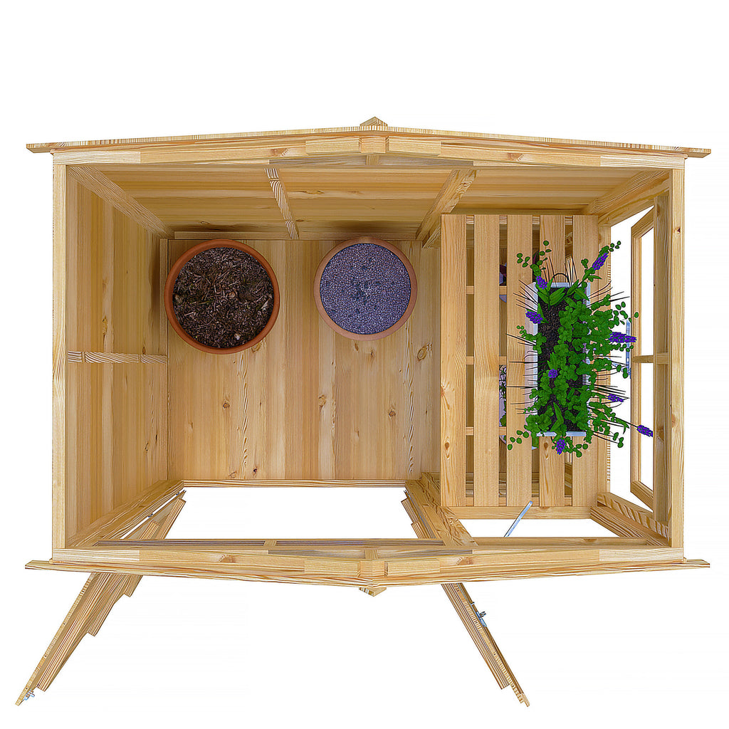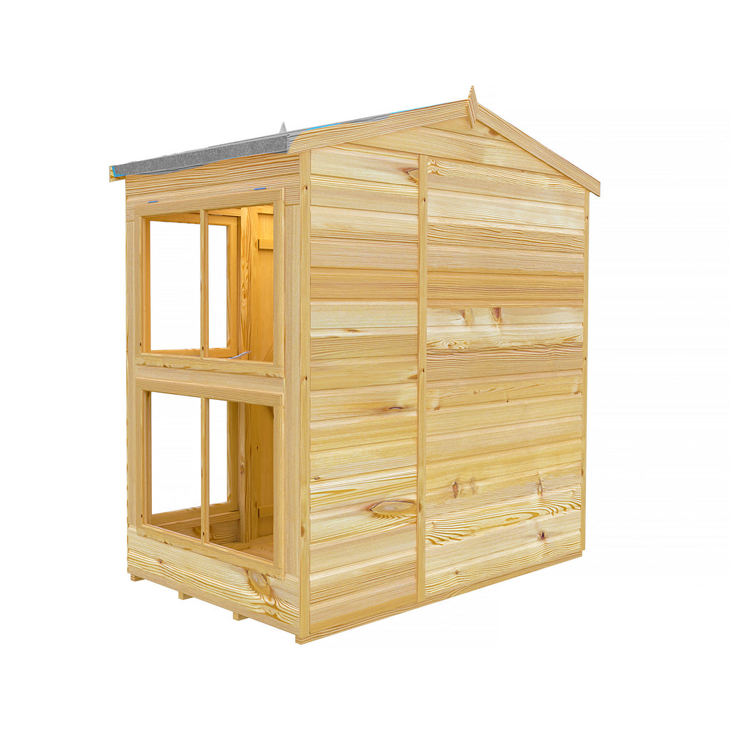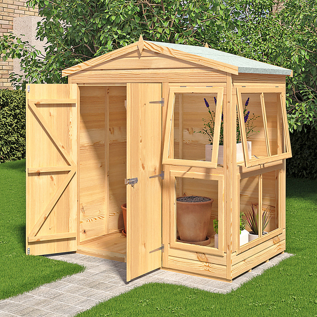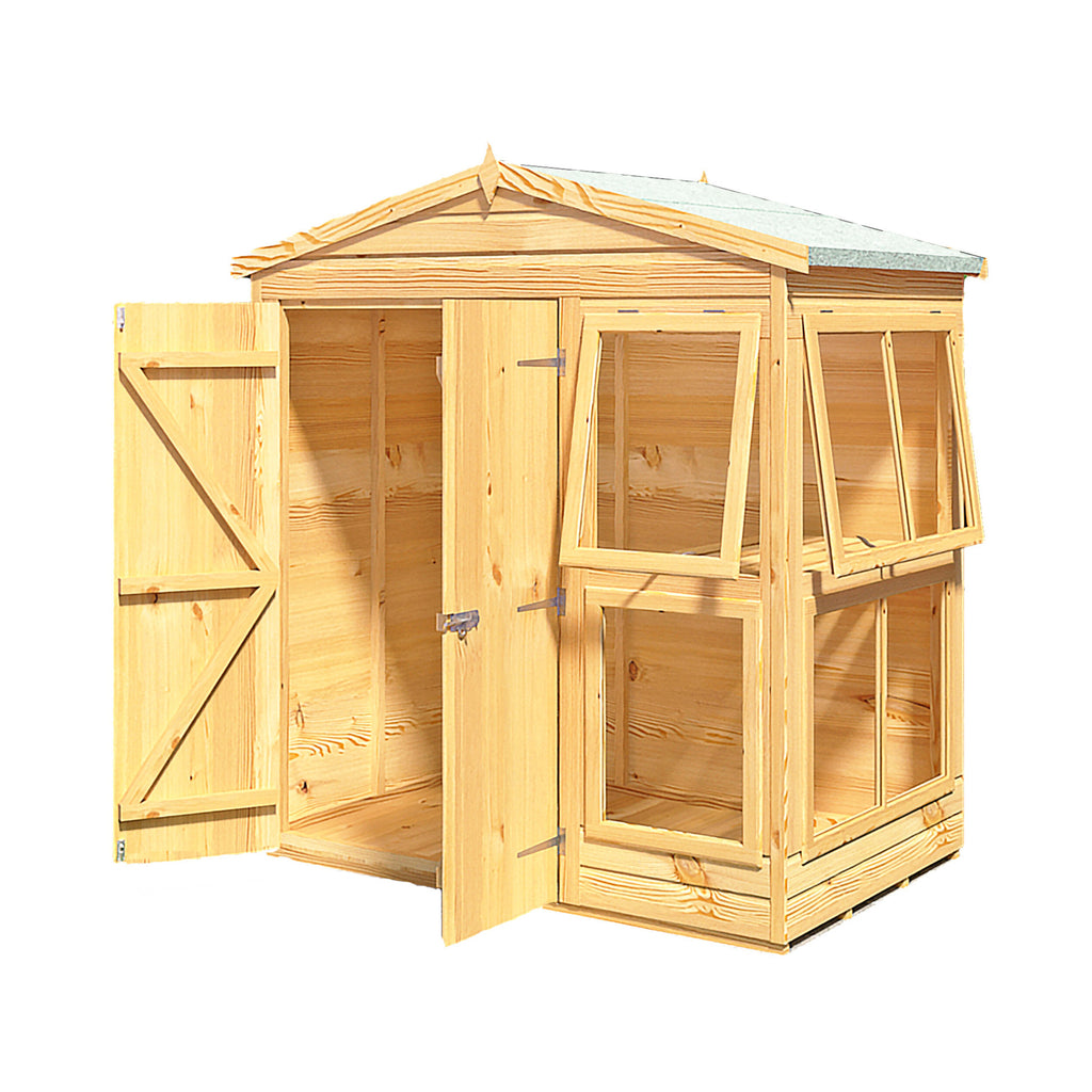 An extremely attractive potting shed complete with a handy bench; as its name suggests the Sun Hut is designed for maximum light! Glazed with toughened glass, the top windows are opening. The shiplap cladding is 12mm slow grown, very high grade FSC approved pine on sturdy 34mm square framing with both floor and roof also in T&G. The framed double door is fitted with a padbolt. The shed has been dipped with a base coat preservative ready for you to top coat to your own preference. Self assembly. Assembly instructions included.