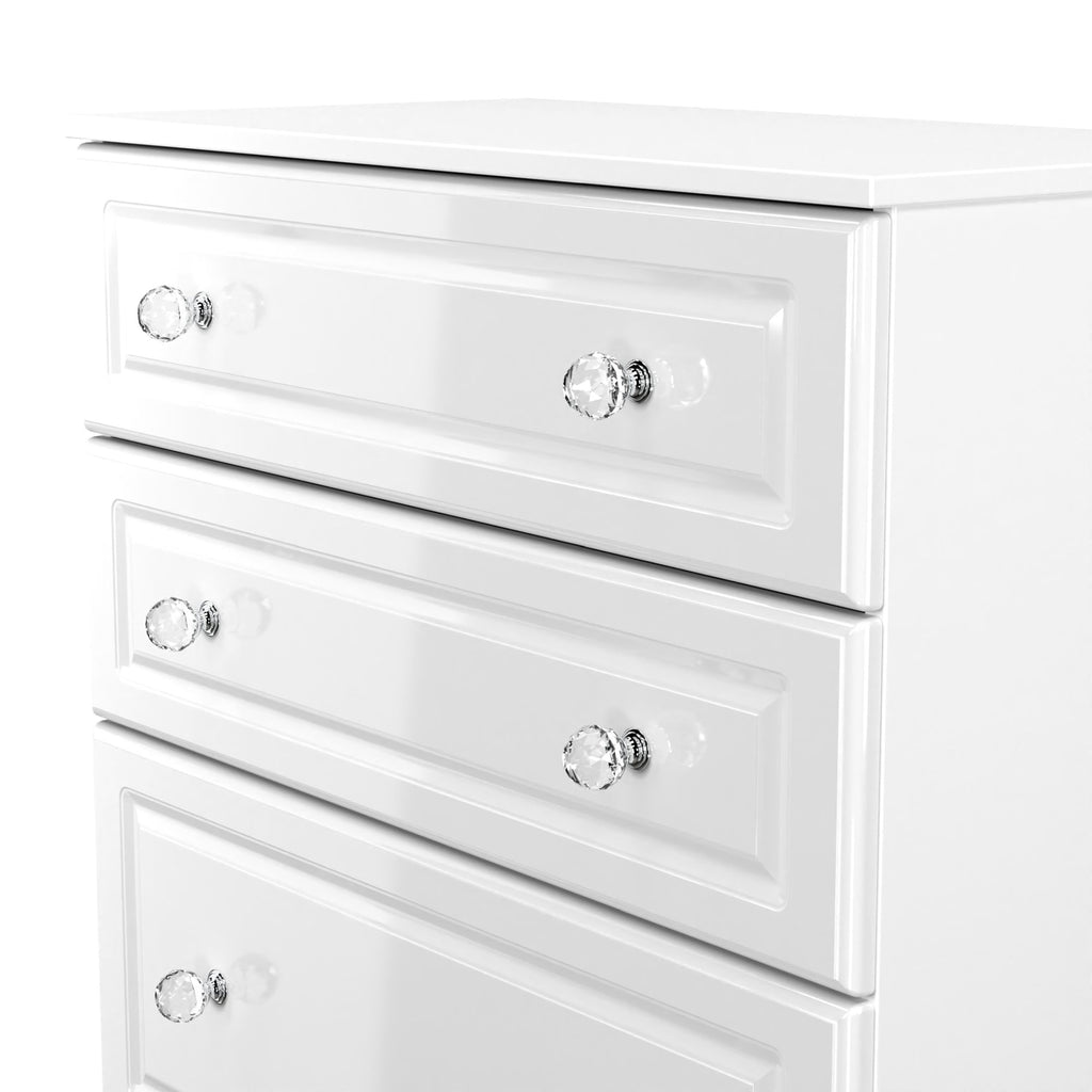 This deep 4 drawer chest of drawers is practical and stylish. Perfect for any home as a free standing storage unit. This is a stylish extensive range of bedroom furniture. It is beautifully finished with a high gloss veneer, featuring Elegant crystal style handles to suit a glamorous lifestyle. Easy to maintain with scratch resistance surfaces. All our furniture is made in the United Kingdom, to the highest quality. It is delivered direct to your location of choice by one of our two man delivery teams, and come full assembled (although legs may be removed to prevent damage in transit).