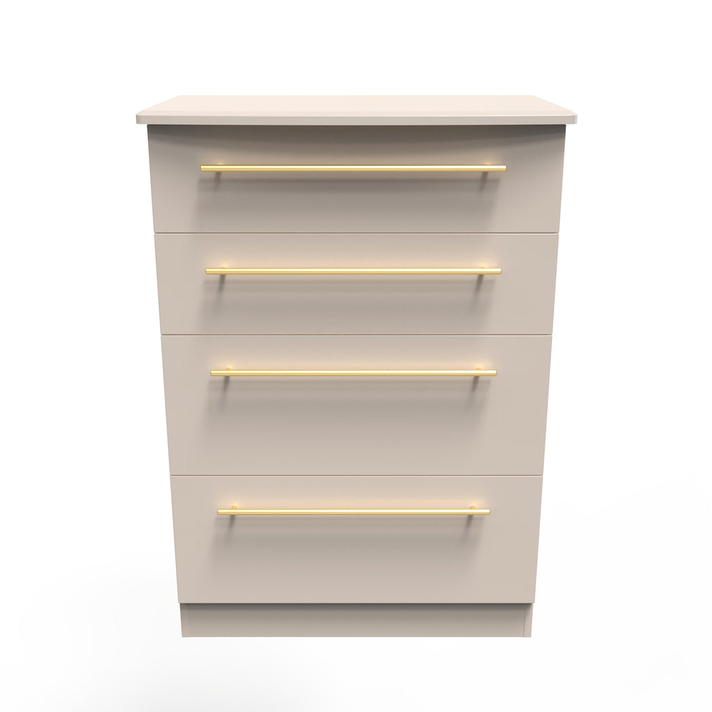 (Dimensions: H108 x W77 x D42cm) This deep 4 drawer chest of drawers is practical and stylish. Perfect for any home as a free standing storage unit. This range is modern and elegant with a smooth clean design. Features sleek gold T-Bar handles and comes ina range of scratch resistant colours. All our furniture is made in the United Kingdom, to the highest quality. It is delivered direct to your location of choice by one of our two man delivery teams, and comes fully assembled (although legs may be removed to prevent damage in transit).