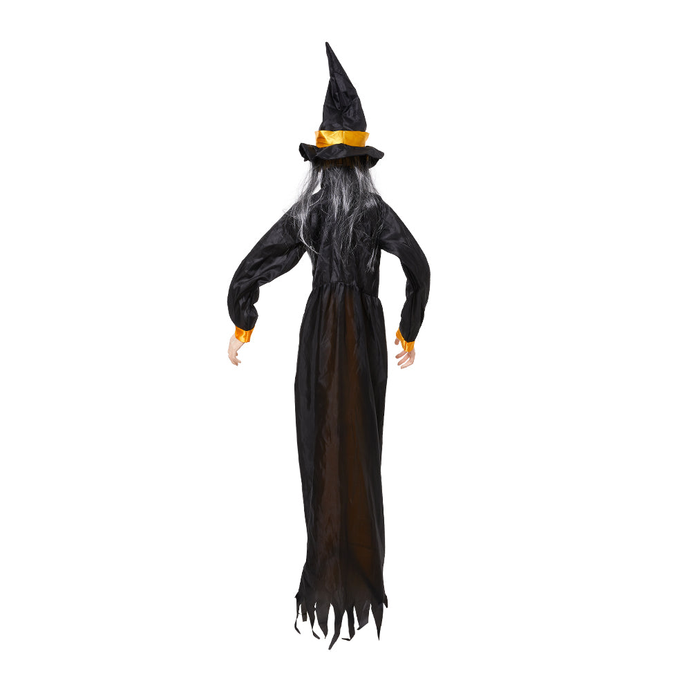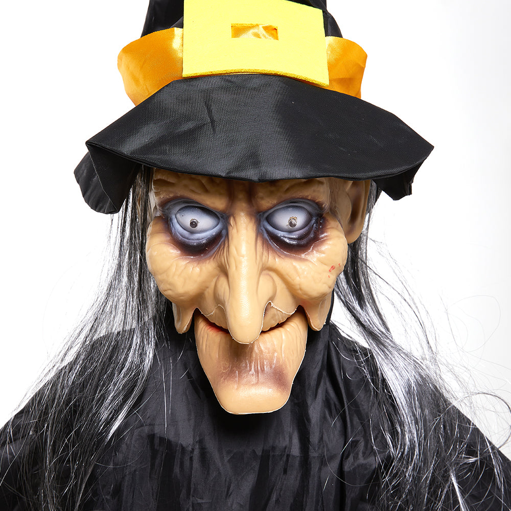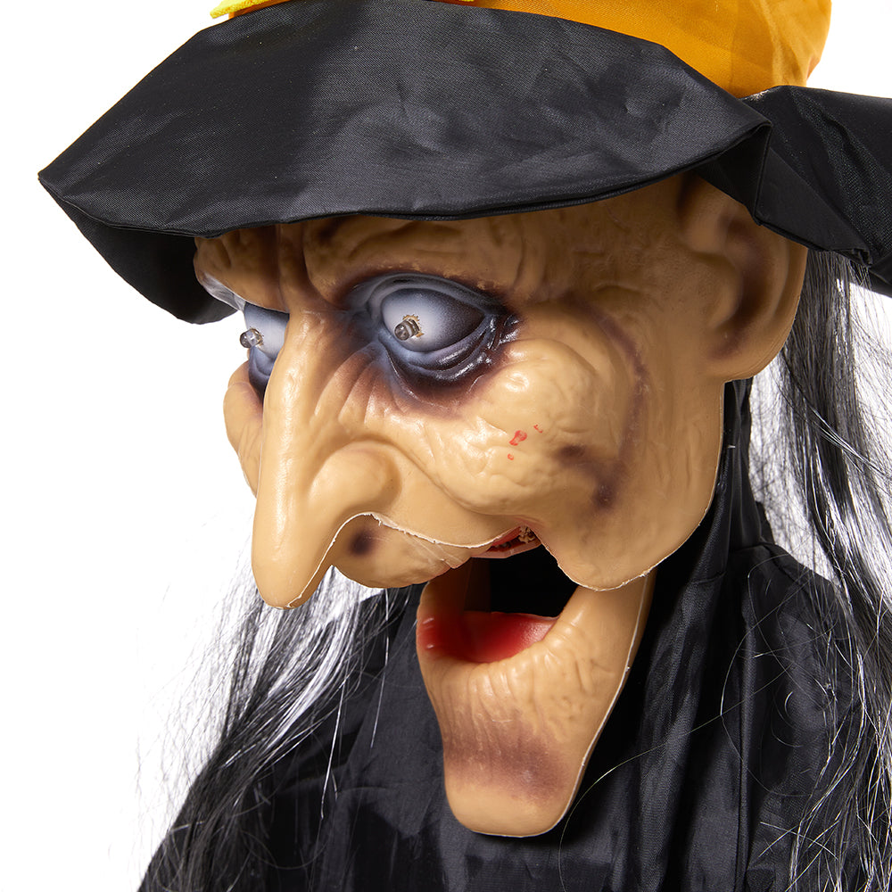 Hang this glowing witch above your front door for an eerie Halloween effect. She wears a black and orange dress with intricate details that capture the holiday spirit. Her pointy hat and red glowing eyes create a mischievous and spooky expression. Sound activation brings her to life when motion or noise is detected. Lightweight and battery-powered, she is easy to hang anywhere for instant Halloween ambiance.