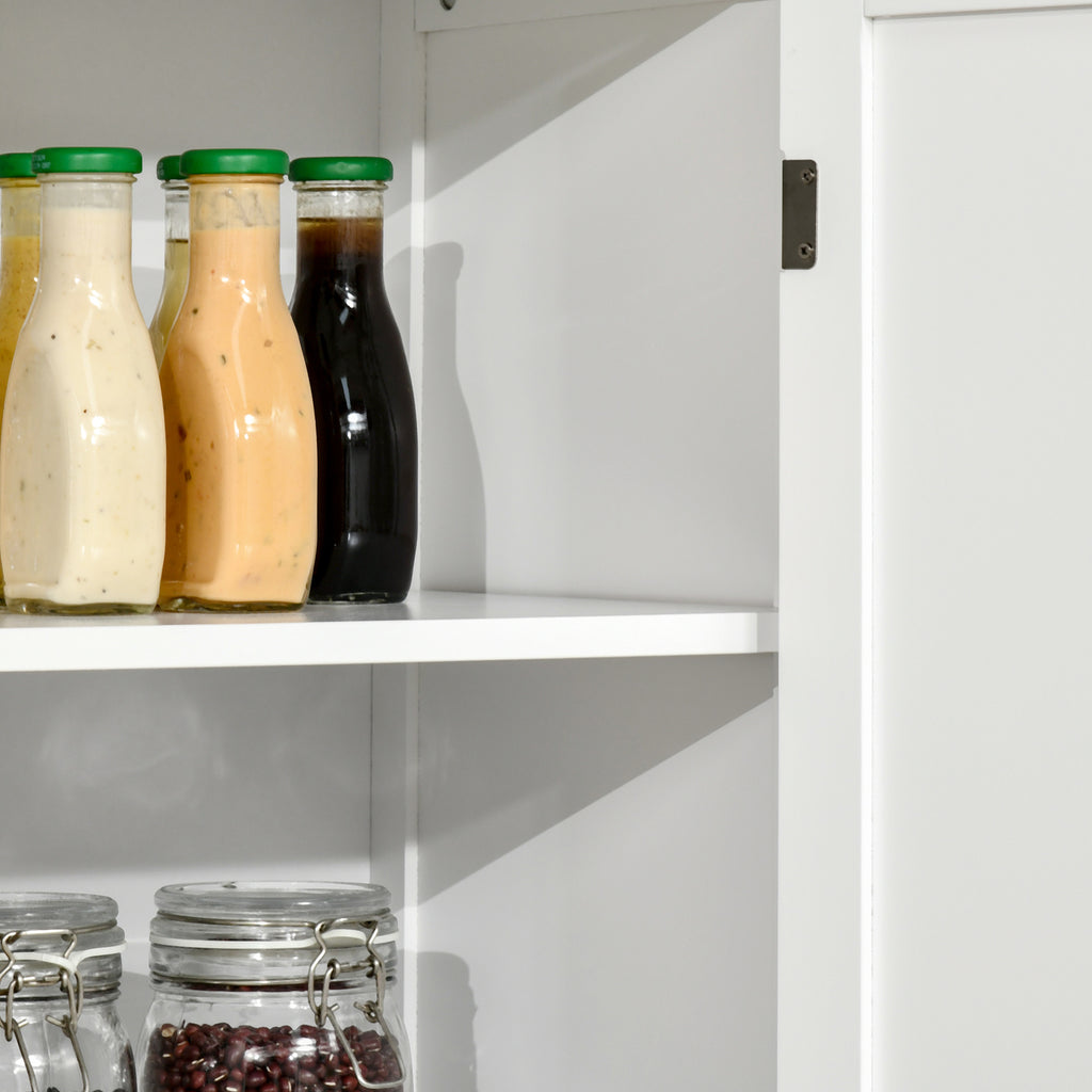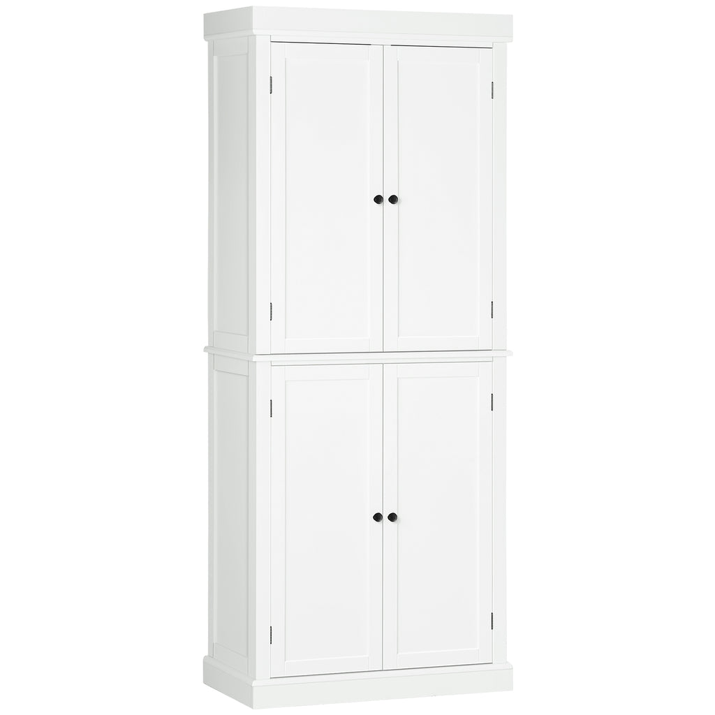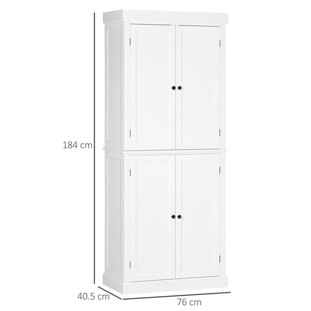 Bring home a beautiful storage unit which you'll love for years to come, thanks to this freestanding kitchen cabinet from HOMCOM. Tall and expansive in size, measuring 184 x 76cm, its spacious design consists of six adjustable shelves to allow flexible storage of food, plates, cutlery, dry food produce and anything else you need to keep stored and organised. Tough and durable for everyday use thanks to the particle board structure, this unit is finished with four doors, providing easy access to the inside, with an anti-tilt design on the back and black knobs for a polished look you'll never get tired of. The refresh your home has been waiting for.