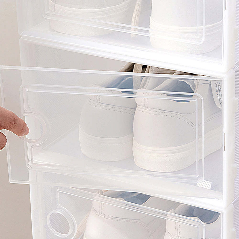 Keep your footwear neatly organised with this Shoe Box Set, the perfect choice for any shoe lover. The set includes twelve individual boxes, each designed to hold one pair of shoes securely. Crafted from durable and transparent plastic, these boxes allow you to easily identify your shoes while protecting them from dust and damage. Their foldable structure saves valuable space when not in use, and the stackable design lets you arrange them in any configuration to suit your storage needs.