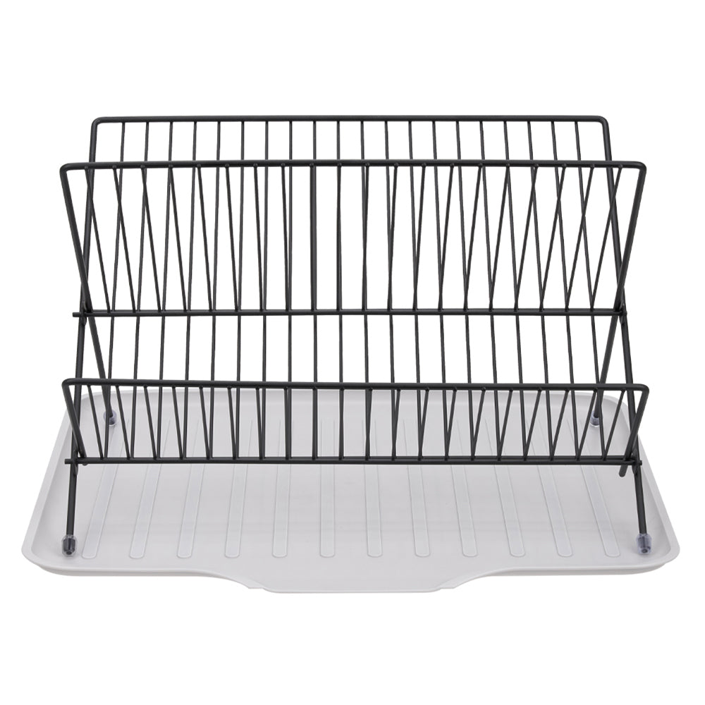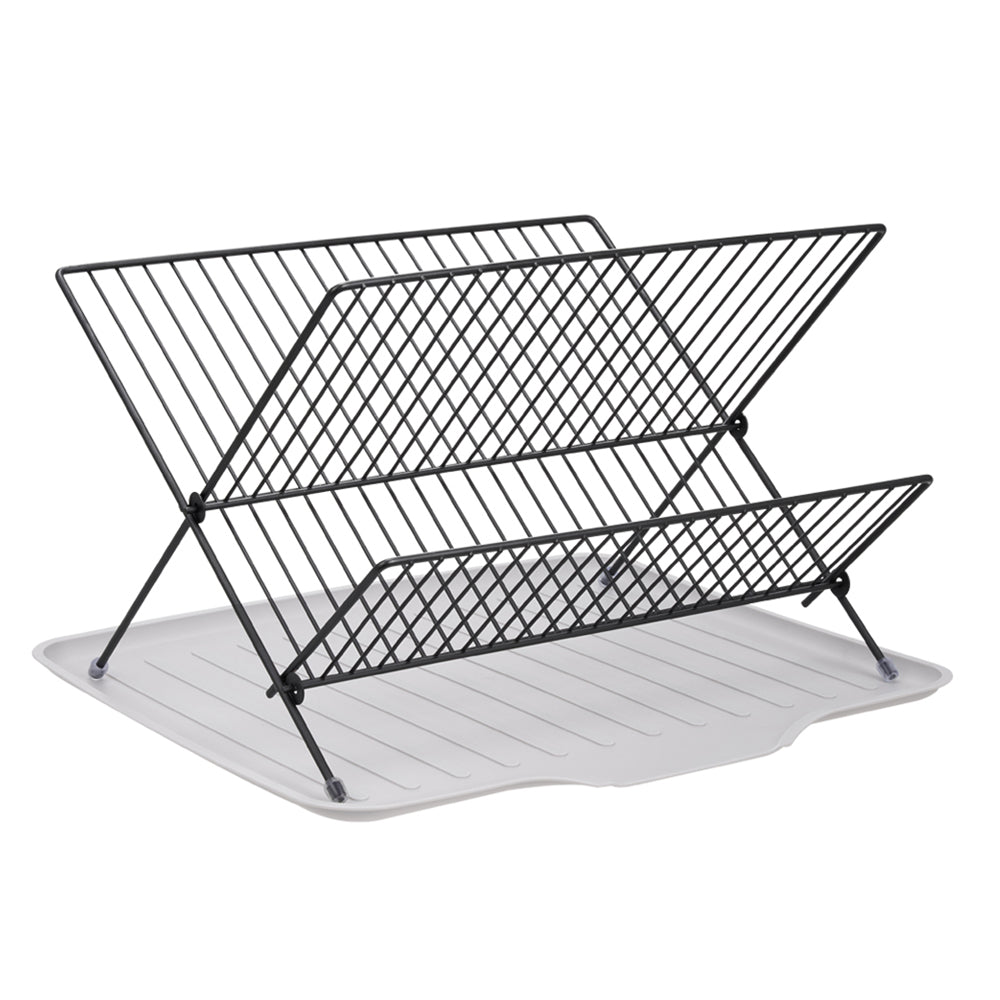 Keep your kitchen tidy and maximise workspace with this Dish Drying Rack. Designed with two spacious tiers, it neatly accommodates plates, bowls, cups, and utensils while promoting fast drying through open-grid ventilation. The removable drip tray directs water neatly into the sink, preventing puddles on countertops. Constructed with a reinforced iron frame and supported by silicone foot pads, this rack is stable, durable, and foldable for easy storage when not in use.