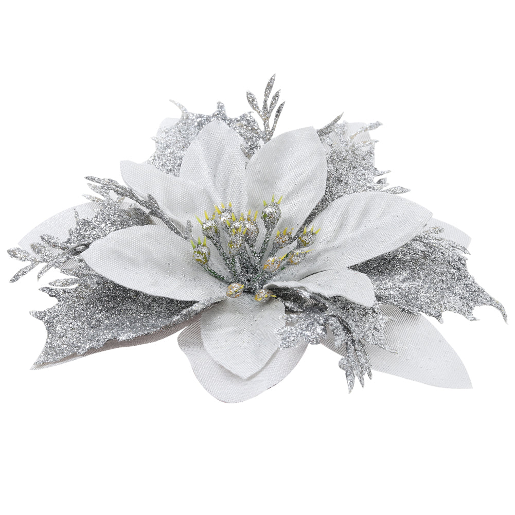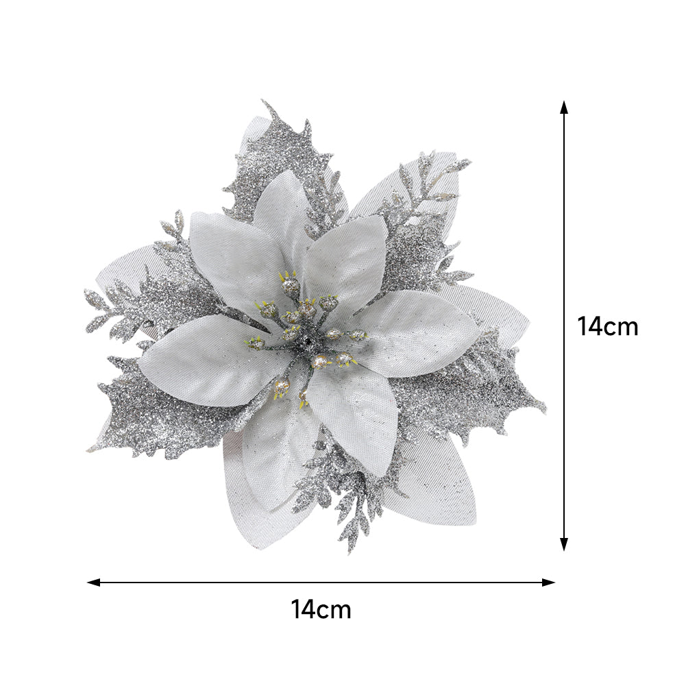Bring a touch of floral elegance to your Christmas decor with this exquisite set of artificial poinsettia flowers. Featuring 24 beautifully crafted blooms in a dazzling silver hue, each flower is thoughtfully designed to capture the look of real petals. The shimmering sequins and metallic silver leaves add a festive sparkle, making them a stunning addition to your Christmas tree, wreath, or table display. Whether used individually or as a set, these radiant flowers will instantly elevate the charm of your holiday decorations.