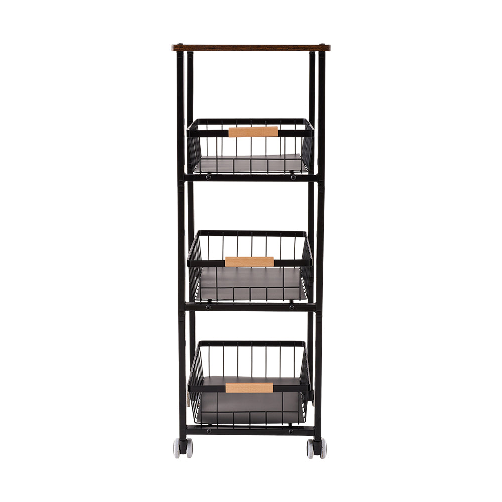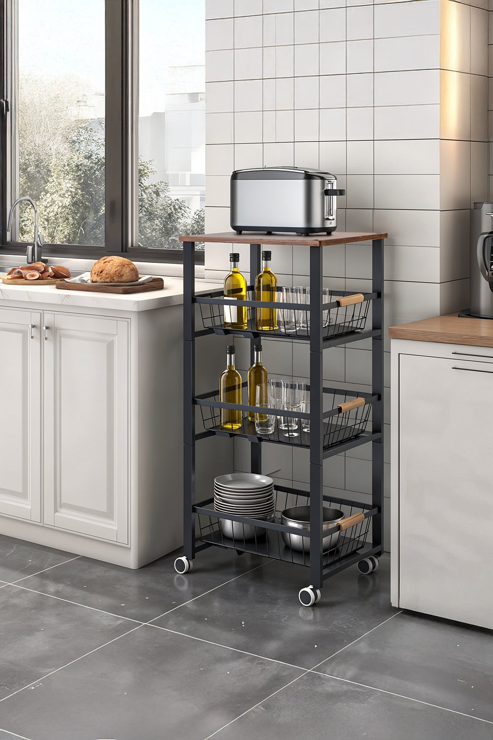 The 4-Tier Kitchen Storage Trolley with Wheels is a versatile solution to maximise your space at home. Its top wooden surface is ideal for microwaves or cookware, while the three lower drawers provide ample room for fruits, vegetables, and kitchen essentials. Wooden handles make accessing your items easy, and 360° swivel wheels with brakes allow smooth mobility or secure positioning. Built with a robust carbon steel frame and finished with moisture-resistant baked enamel, this trolley is durable and long-lasting. Detachable PVC pads make cleaning simple. Perfect for kitchens, living rooms, bedrooms, or balconies.