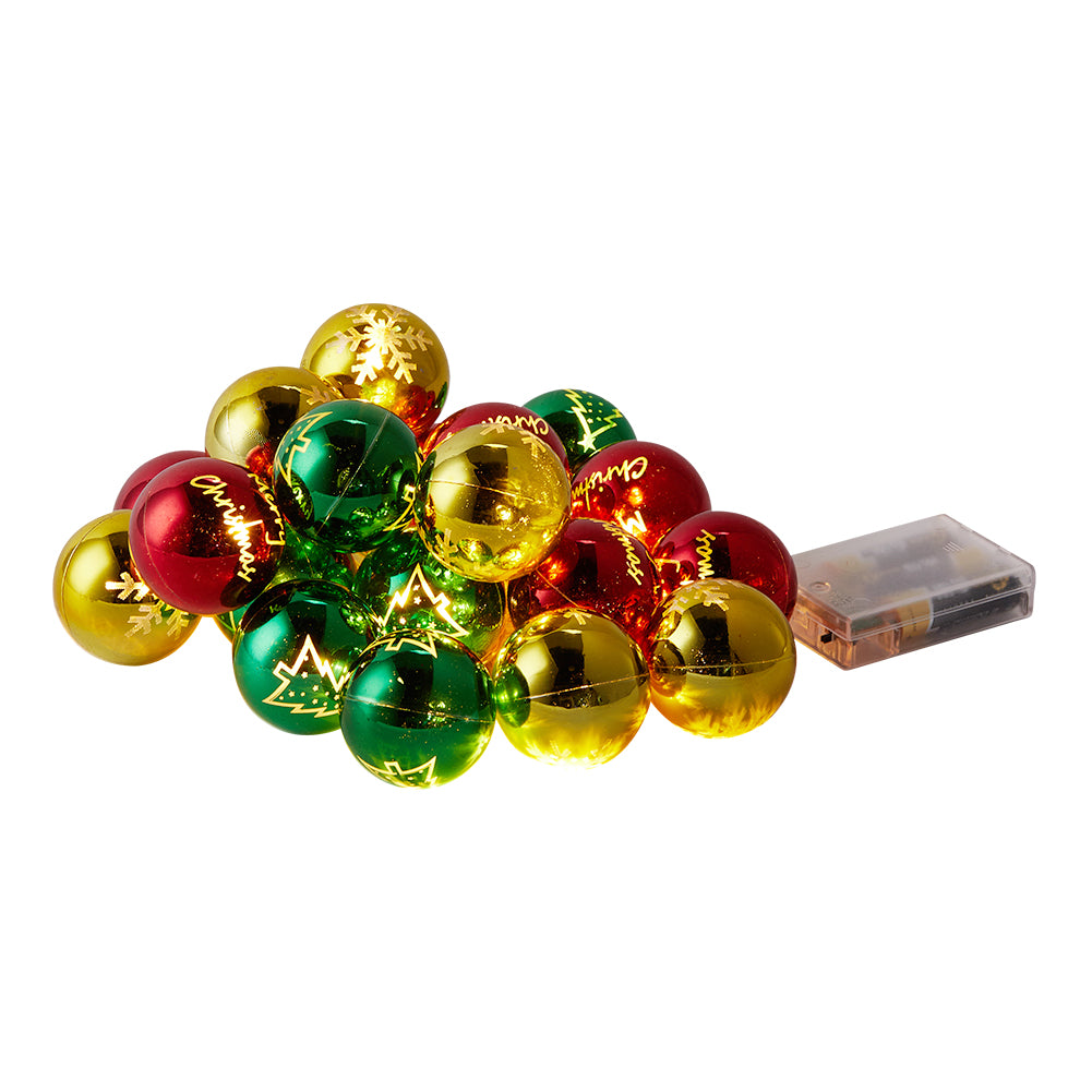 Add a festive sparkle to your home this Christmas with this beautiful bauble light string. Featuring a mix of glittering red, green, and gold baubles, it brings instant holiday cheer. The 3-metre string holds 20 LED lights, ideal for decorating your tree, mantelpiece, or staircase. Battery-powered for effortless placement, you can create a warm, festive glow without worrying about trailing cords.
