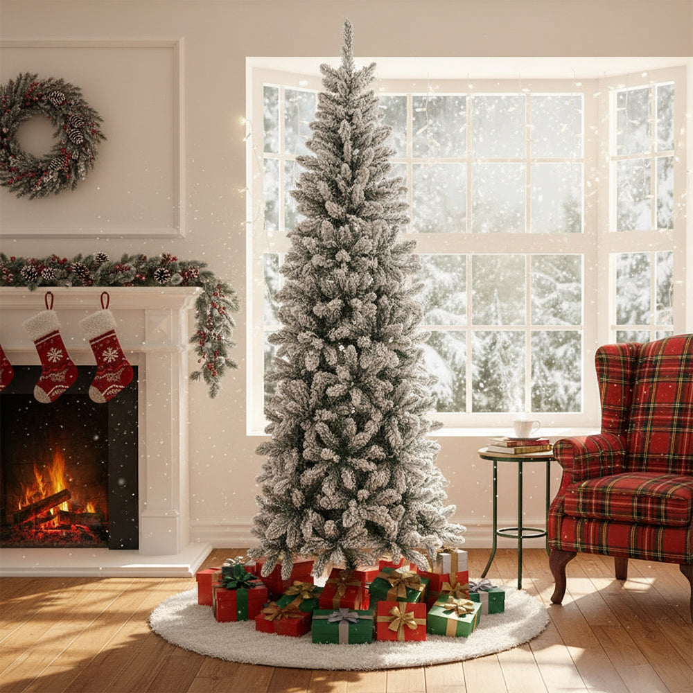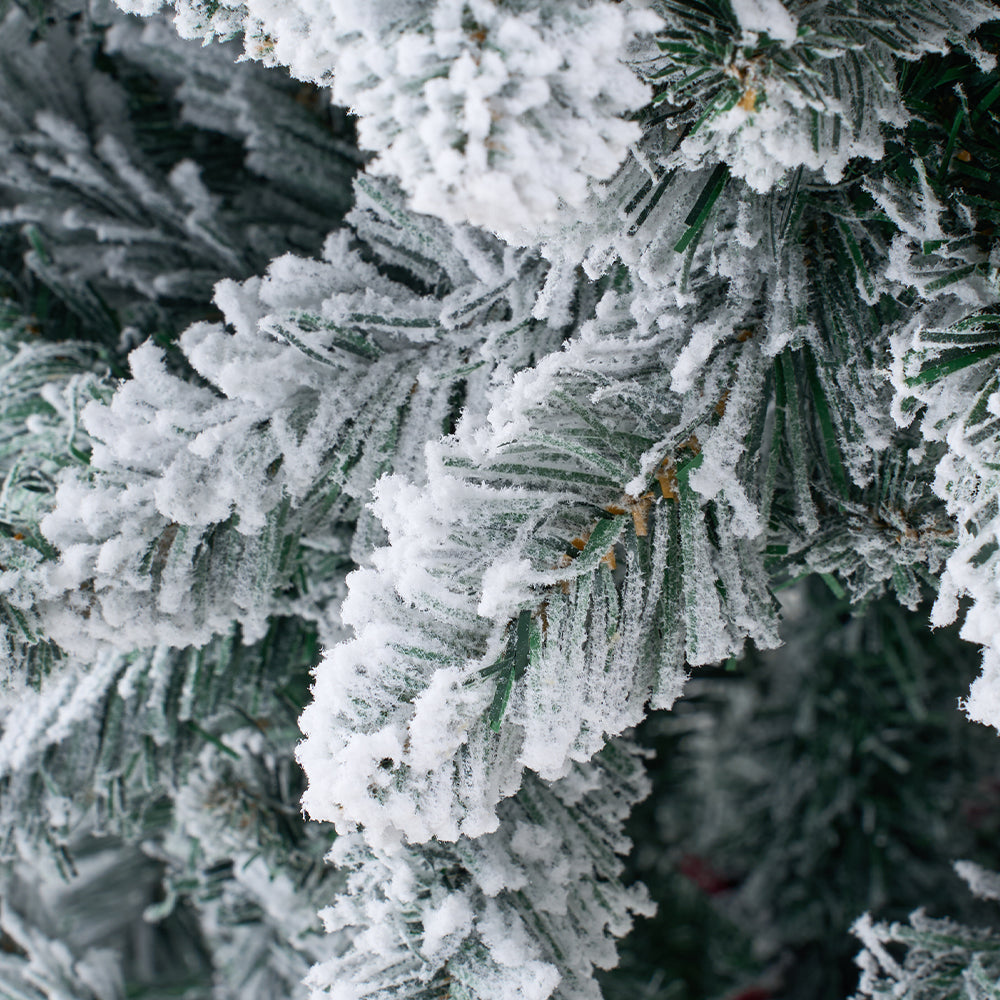 Bring the tranquil beauty of a winter forest into your home with this flocked artificial Christmas tree. Carefully crafted to replicate snow-dusted pine branches, it exudes a naturally elegant and festive appearance. The layered branches form a full, balanced silhouette, with evenly spaced tips that make displaying your favourite decorations effortless. Supported by a robust X-frame metal stand for enduring stability, this tree is a timeless centrepiece that fills your space with festive warmth and enduring seasonal charm.
