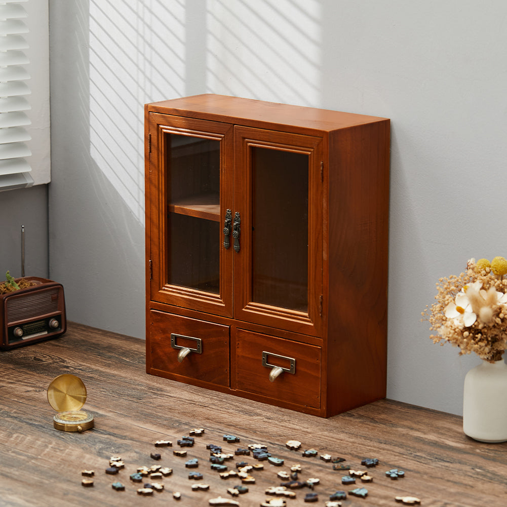 Prepare to be captivated by the Lifeideas storage organiser, a true embodiment of vintage charm. Its lustrous wooden exterior radiates warmth and character, inviting you to embrace a sense of nostalgia. Behind the glass doors, two shelves provide an elegant display for your prized possessions, while metal handles add a subtle industrial touch to the timeless design. The two drawers offer practical storage, keeping your essentials neatly organised. Compact yet versatile, this organiser is perfect for desktops, countertops, or any space in need of stylish storage.