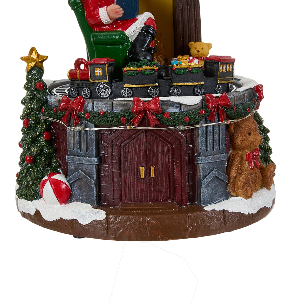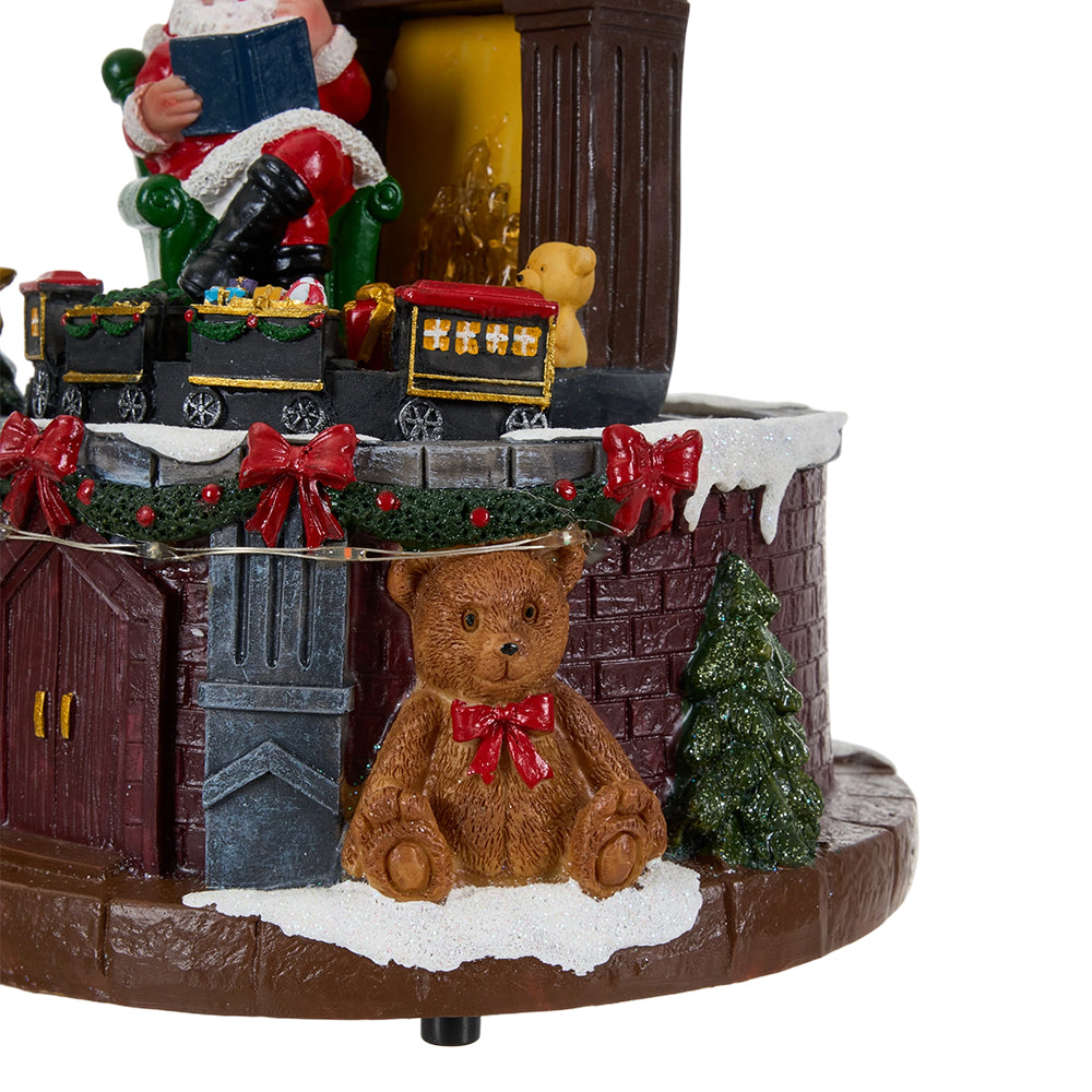 Enhance your festive décor with this charming Christmas Music Box! Santa Claus is seated comfortably in his festive chair by the fireplace, capturing the spirit of the season as he reads. A delightful house is surrounded by a whimsical scene featuring Christmas trees, a cheerful bear, and other festive decorations. A miniature train moves around the base, adding a playful and interactive touch. With intricate detailing and warm LED lights, this music box creates a cosy and inviting holiday atmosphere. Ideal for display on a mantel or as a treasured gift, it brings the magic of Christmas to life.
