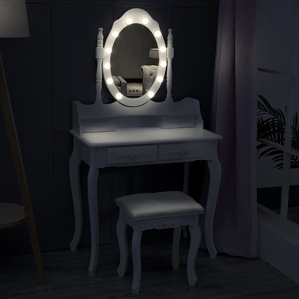 This contemporary vanity table set from Livingandhome offers a complete solution for any bedroom. The set includes a table with four drawers, an oval LED mirror, and a comfortable cushioned stool. The mirror is framed with 12 soft LED bulbs supported by classic stand columns, providing elegant illumination for any makeup environment. The four spacious drawers are perfect for storing jewellery and personal treasures, while the thickly cushioned stool ensures comfort during extended use. Combining style, practicality, and quality materials, this vanity table elevates any bedroom décor.