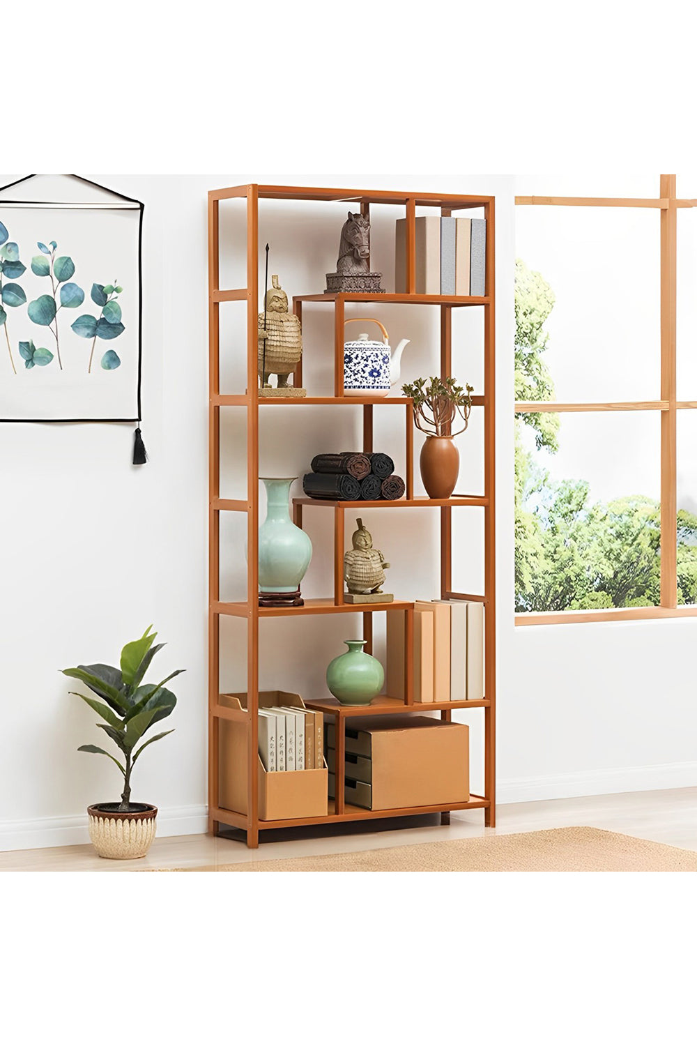 Crafted from high-quality wood, this tall display rack features a geometric design, providing a stylish and distinctive way to showcase books, magazines, decorations, and other collections. Its sturdy construction ensures practical use while adding a decorative element to your space. Ideal for offices, hallways, or living rooms, the natural wood tones blend effortlessly with existing furniture and decor.