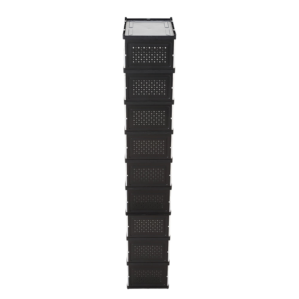 The 9-Layer Stackable Shoe Organizer provides a sleek and practical way to keep your footwear organised and easily accessible. Designed with nine generous compartments, it offers ample storage for all types of shoes, from trainers and heels to ankle boots. The transparent flip-down lids make it simple to view and select your shoes while keeping them dust-free. Built from durable PP and PS materials, the cabinet ensures long-lasting use with strong structural stability. When not needed, it conveniently folds flat for compact storage, making it ideal for hallways, bedrooms, or wardrobes.