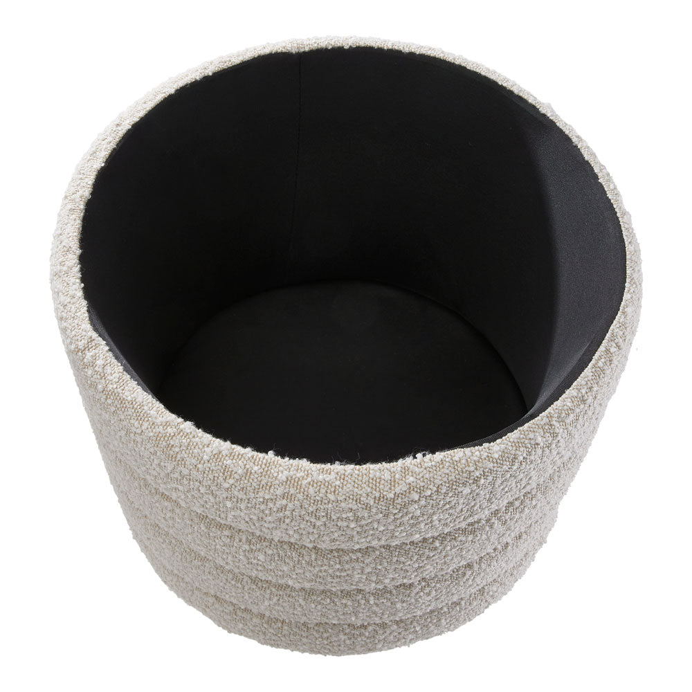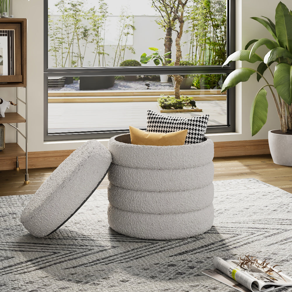 The Beige Upholstered Round Storage Ottoman combines elegant design with practical functionality. Upholstered in soft boucle fabric and padded with sponge, it provides comfortable seating or a cosy footrest. The removable cover reveals a hidden storage compartment, perfect for organising everyday items. Supported by sturdy non-slip plastic legs, it ensures stability while protecting your floors. Compact and versatile, this ottoman enhances living rooms, bedrooms, or makeup areas with both style and practicality.