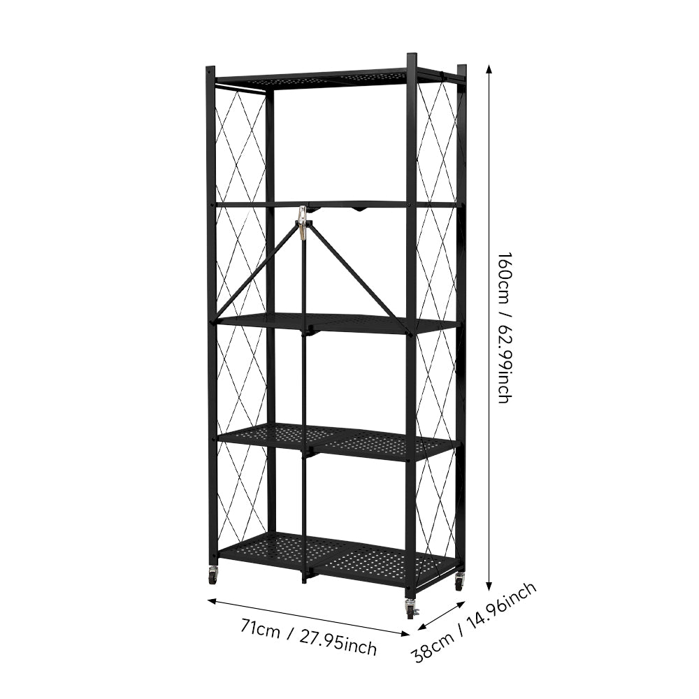 The Black 5-Tier Metal Storage Rack offers practical organisation with a sleek, modern design. Made from durable carbon steel with a baked paint finish, it resists rust and deformation for long-lasting use. Its open, five-tier layout allows easy access to items while the side guardrails prevent objects from falling. Hollowed-out panels provide breathability and drainage, making it ideal for kitchen, office, or household storage. Foldable for compact storage and fitted with silent omnidirectional casters, it is ready to use and highly versatile.