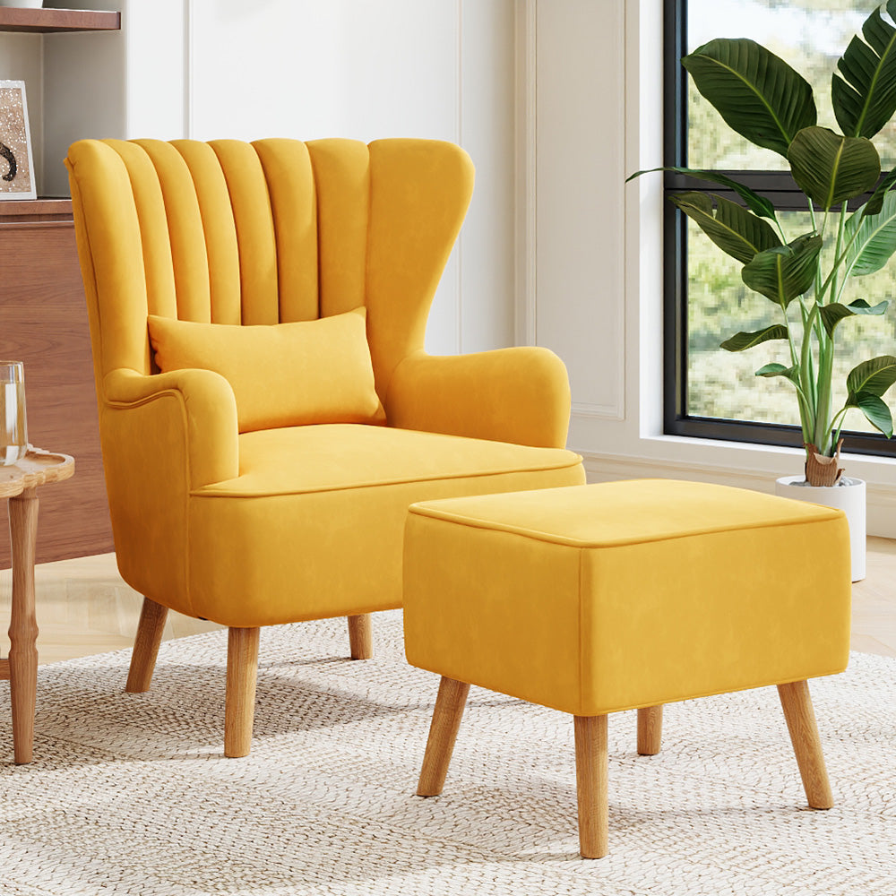 This upholstered armchair features a sleek, contemporary design, making it a stylish addition to any home or office. The smooth seat, high back, and supportive armrests ensure maximum comfort, while the extra padded cushion provides added relaxation. Supported by sturdy wooden legs, the chair embodies a mid-century aesthetic. Included with the set is a matching footstool, perfect for resting your feet and further enhancing the overall seating comfort.