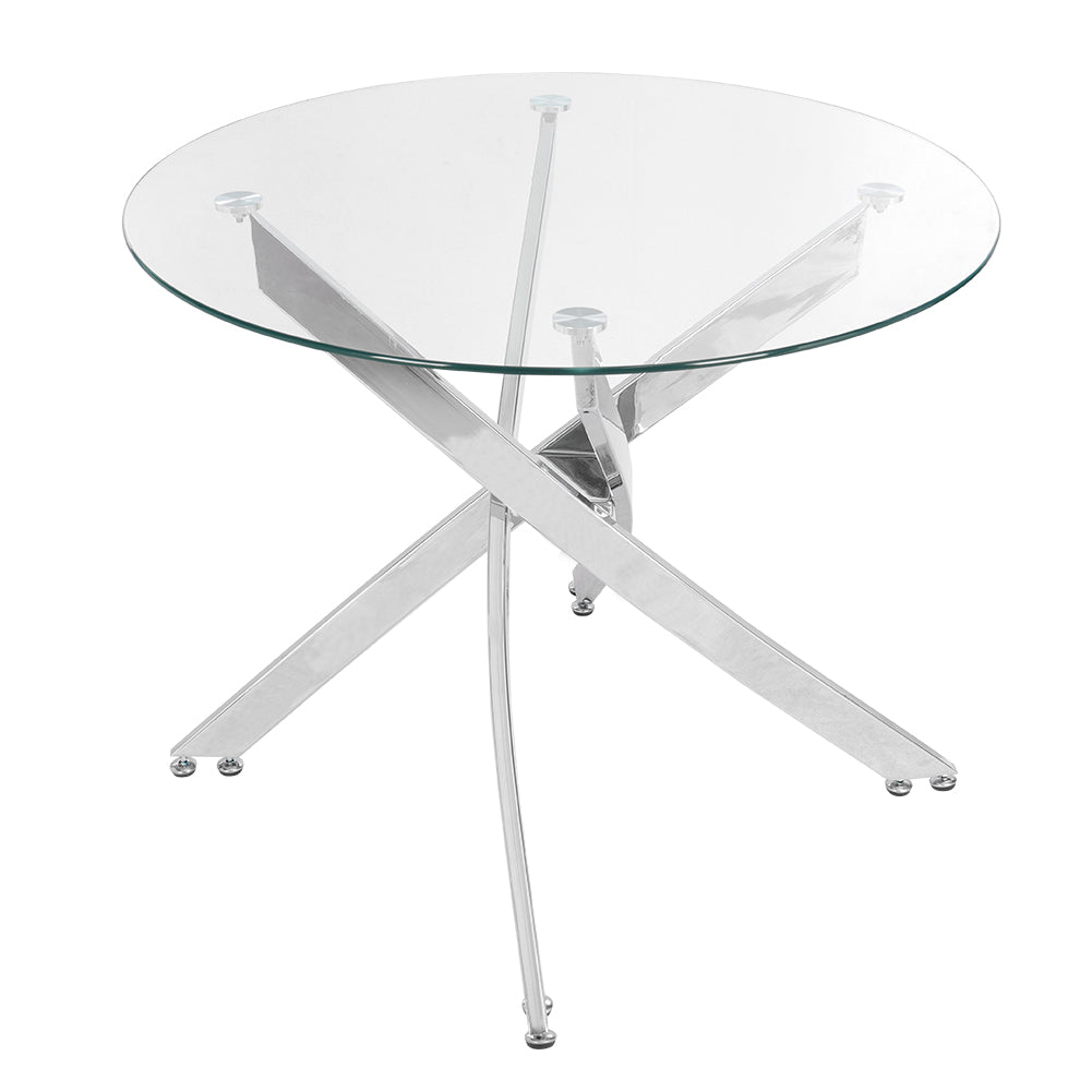 This Minimalist Tempered Glass Coffee Table is a contemporary centerpiece for any modern living room. Its clear tempered glass top is heat-resistant and perfect for placing coffee cups, dishes, or decor. Supported by four beveled chrome legs arranged in a cross cluster, it combines stability with eye-catching style. Compact yet functional, this table comfortably accommodates four people and enhances smaller living spaces with elegance.