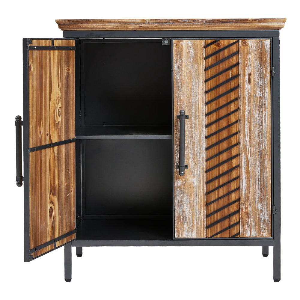 Keep your home organised in style with this Rustic Wooden Cabinet with Interior Shelves. Crafted with a distressed technique, it blends vintage charm with practical modern functionality. The cabinet features two doors that open to reveal two interior shelves, providing ample space for storing household items while keeping them protected from dust and moisture. Its sturdy fir wood construction with metal handles ensures durability, and anti-slip pads on the legs enhance stability. The attractive wood grain pattern adds a warm and timeless aesthetic to any room.