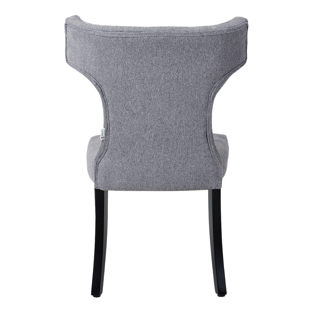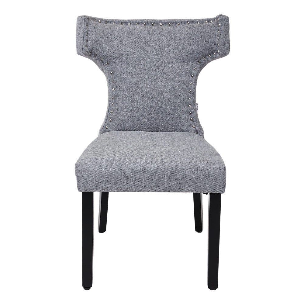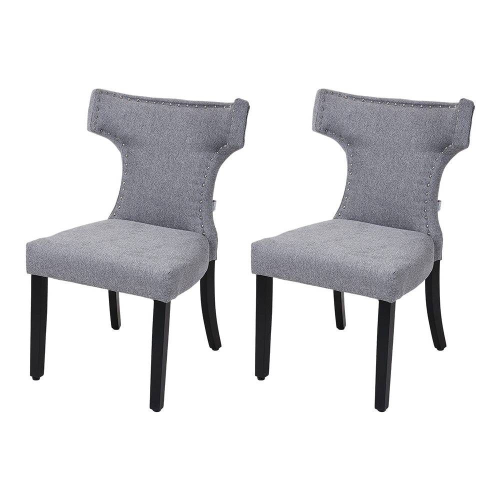 Selecting the right chairs is essential for creating a welcoming dining area, and these dining chairs combine elegance with comfort. Their gently curved backrests create a refined silhouette, while the decorative nailhead trim adds a subtle touch of style. The well-padded seats strike the perfect balance between firmness and softness. Each chair features four black-painted, splayed wooden legs for maximum stability. The neutral grey upholstery blends effortlessly with a variety of interiors, from modern minimalist to classic traditional. Their versatile design also makes them ideal as accent chairs in bedrooms or reception areas, providing additional seating without compromising on style.