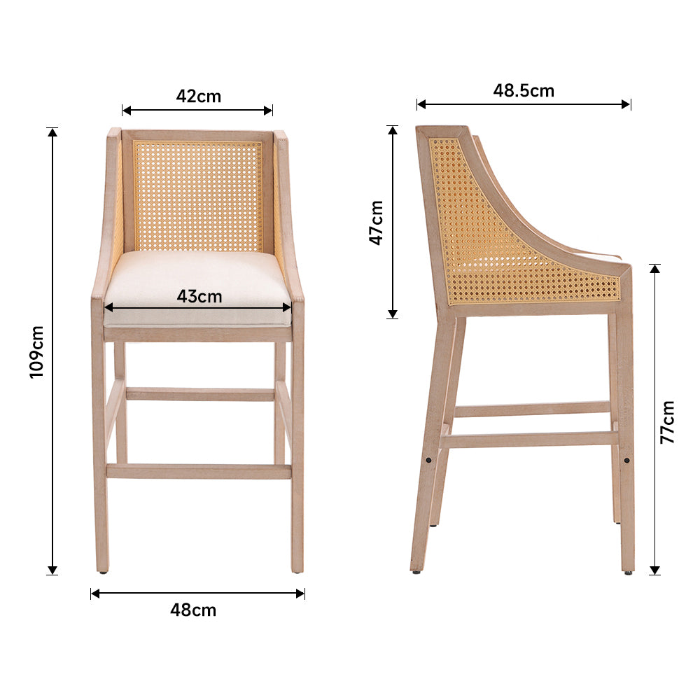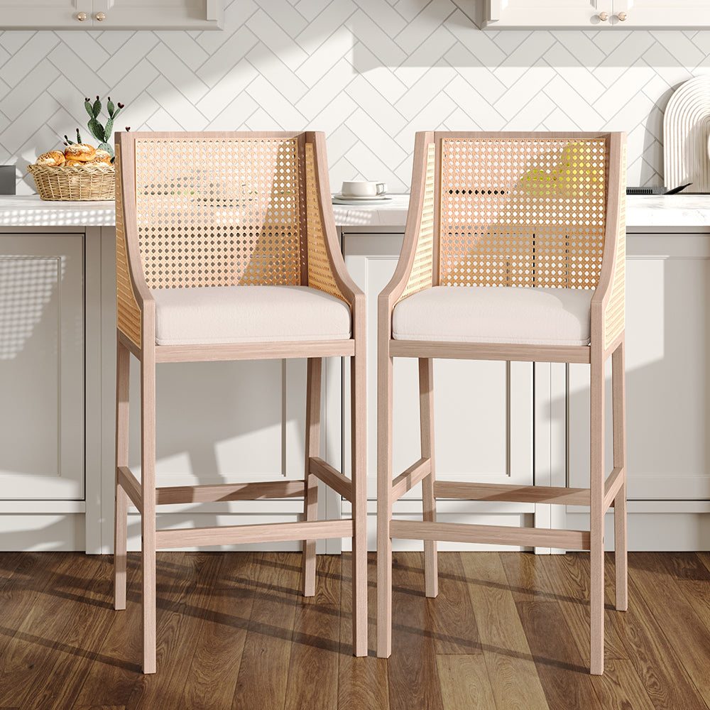 The Set of 2 Wooden Frame Bar Stools combines modern elegance with everyday practicality, perfect for kitchen islands or home bars. Each stool features a breathable rattan weave back and plush faux cashmere seat for exceptional comfort during long sitting. The sturdy wooden frame with rubberwood legs provides reliable stability, while the footrest and adjustable pads ensure balance on any surface. Blending natural tones with sleek design, these stools effortlessly elevate your dining or entertaining space.