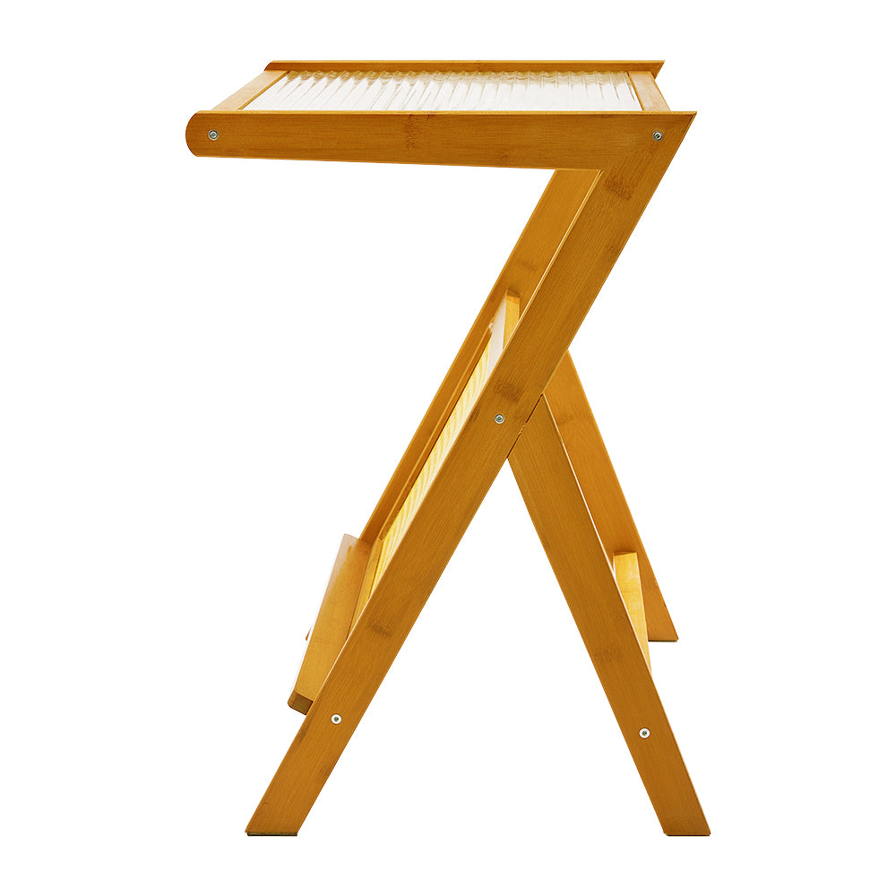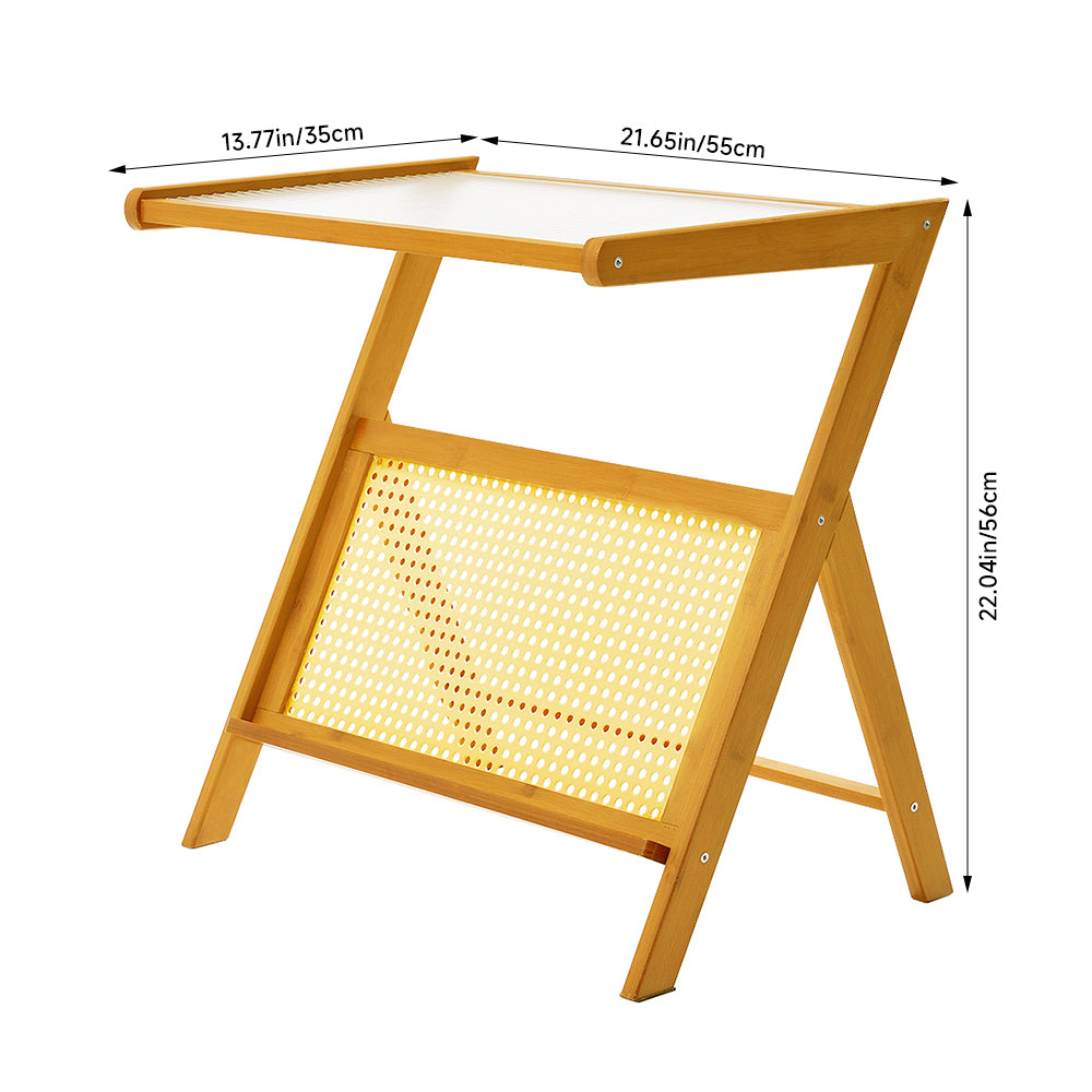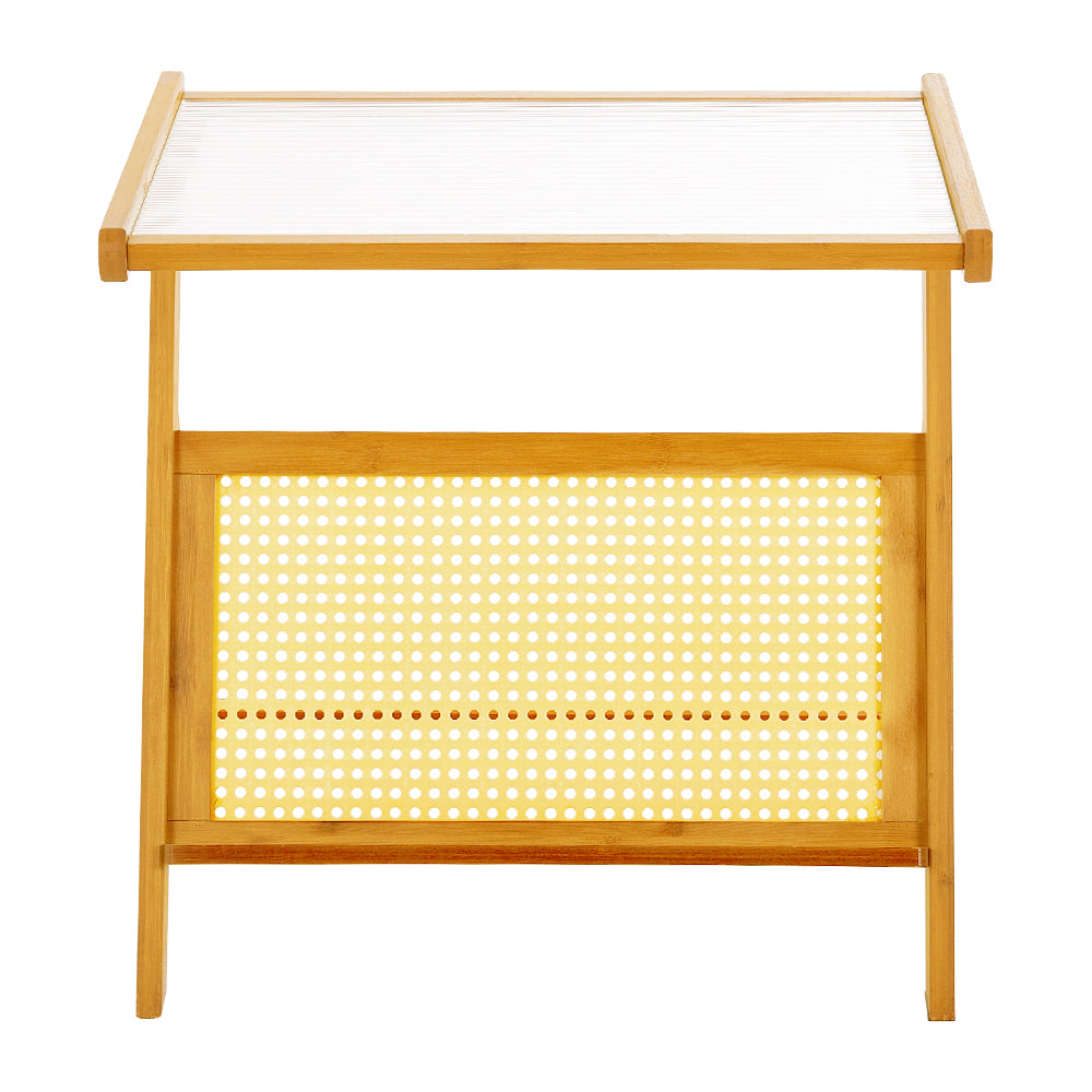 Add a touch of casual elegance to your living space with this stylish bamboo side table. Featuring a clear ribbed glass tabletop atop a sturdy bamboo frame, it brings both stability and an airy, sophisticated aesthetic. The L-shaped lower shelf provides extra display space for magazines, photo albums, or vinyl records, while the warm brown finish adds a natural, inviting feel. Perfect for small balconies, living rooms, or beside a sofa, it effortlessly enhances any setting for relaxation or entertaining.