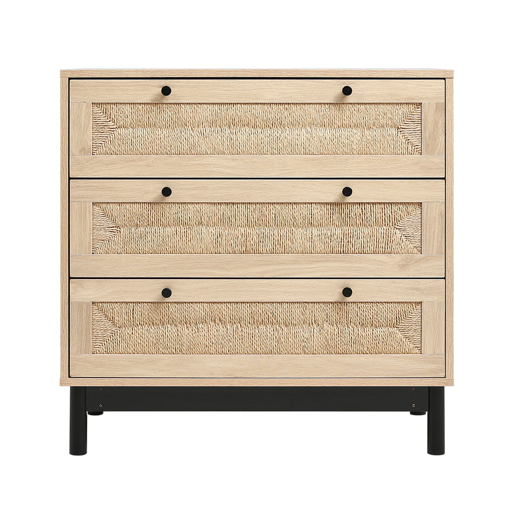 Bring warmth and elegance to your home with the Stylish Natural Wood Cabinet. Designed with a farmhouse-inspired style, the handwoven drawer fronts add a natural, textured charm that enhances any living space. Supported by sleek black cylindrical legs, this cabinet combines aesthetic appeal with practicality. The three generously sized drawers provide ample storage for household essentials, making it perfect for living rooms, bedrooms, or hallways.